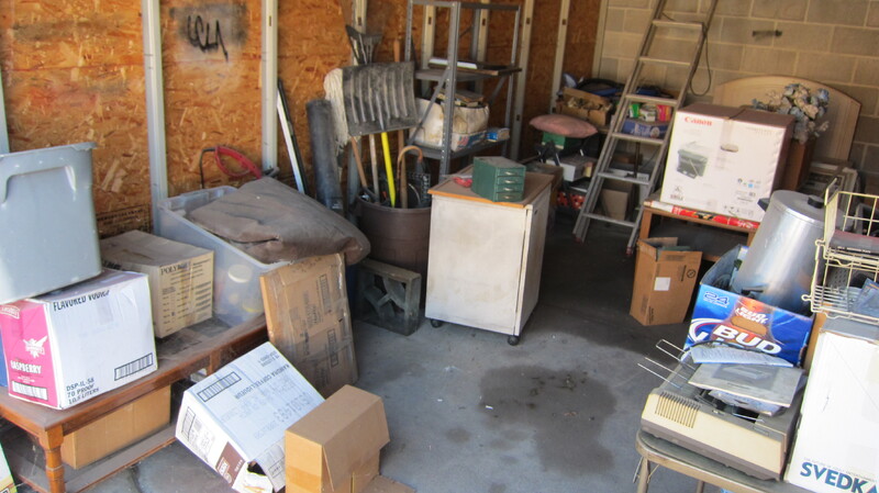 Books, boxes, fake flowers, pictures, old printer, coffee table, end table, single bed frame w/head board, pictures, rakes, shovels and small tool box.