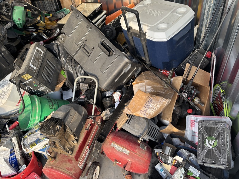tile saw, 2 air compressors, welder, grinder, tool box, air tools, cooler, fishing poles, belt sander, bicycle.