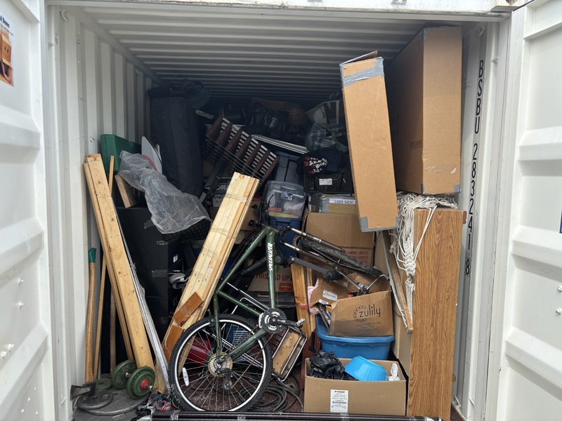 All items inside this BSB unit are up for auction. Which is loaded with what we believe to be furniture, a bike, weights, totes, filing cabinet, a weed whacker, totes, large boxes, and other miscellaneous items