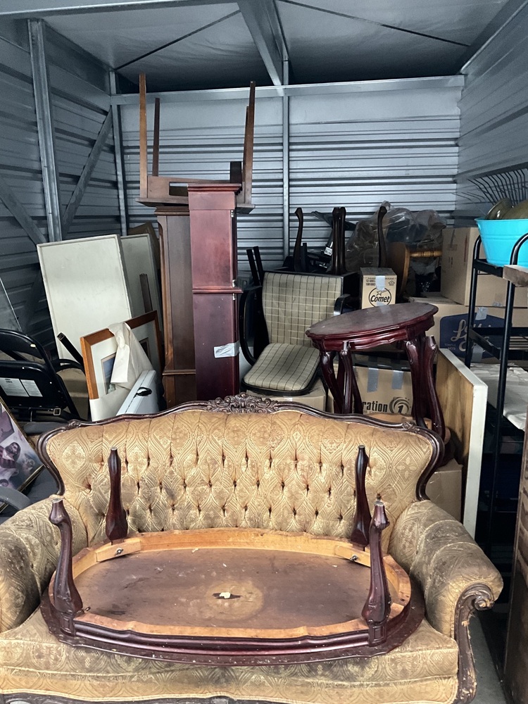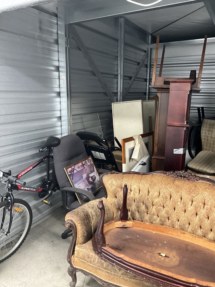 furniture, antiques, bicycle, paintings/frames, boxes, shelving, bins, cleaning tools, etc