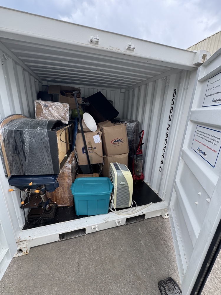 All items inside this BSB container are up for auction. Which is loaded with what we believe to be furniture, a drill press, a vacuum, and other miscellaneous items