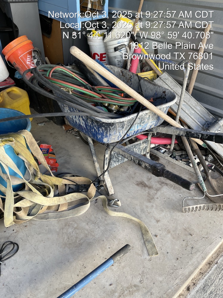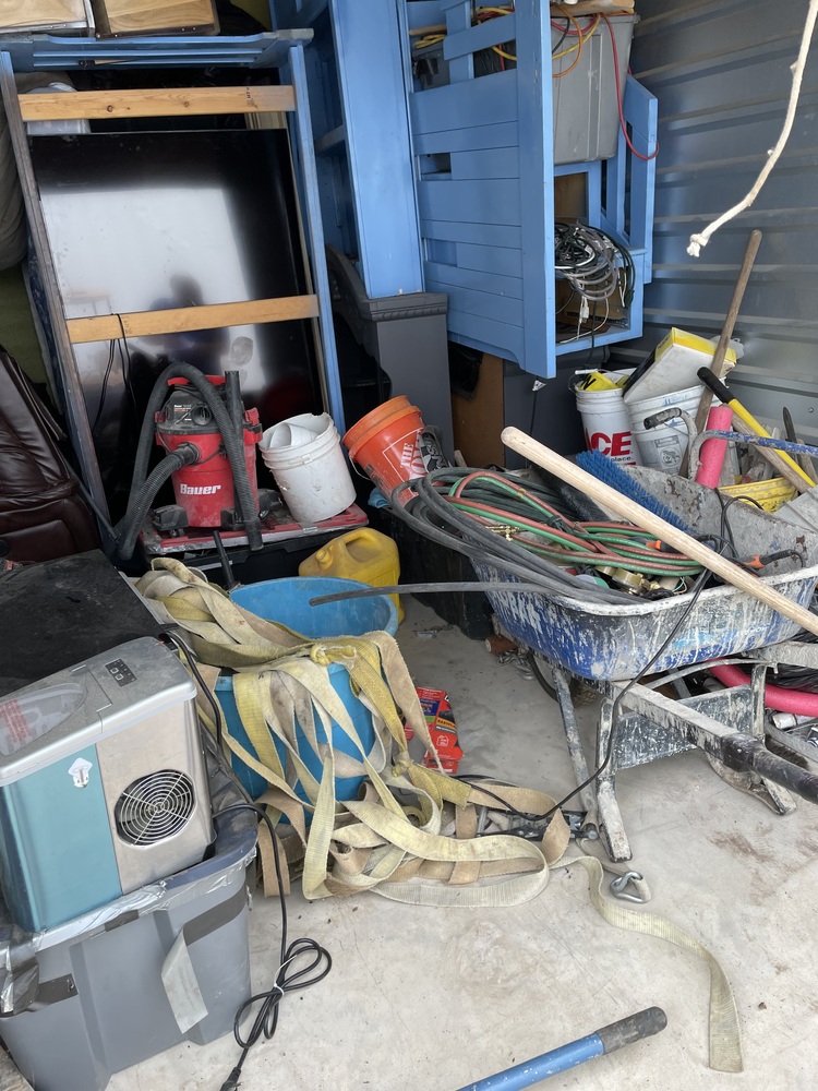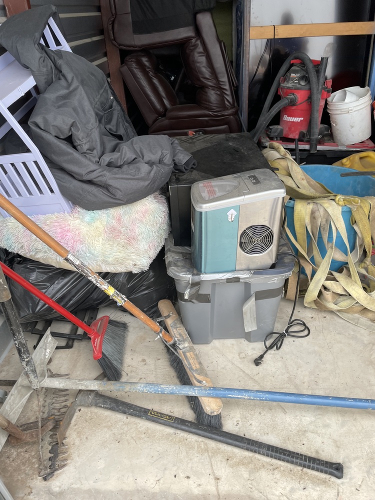 Sofa, TV, Kitchen Appliances, Bed, Tools, Shop vac, Concrete Tools, Bean Bag Chair, Wheelbarrow, Totes, Misc. items