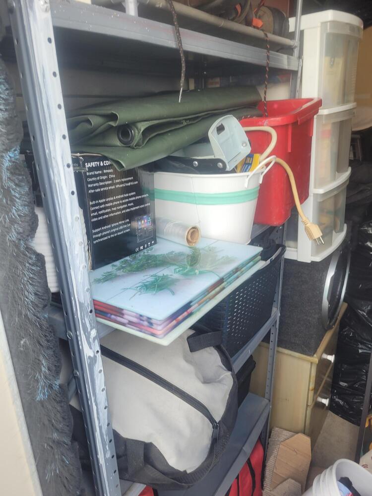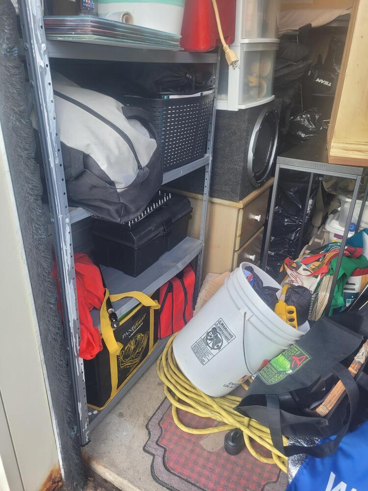 Floor Mat, shelving unit Broom, totes boxes, bags, hockey bag, cutting board basket, shoes, subwoofer nightstand chair ECT