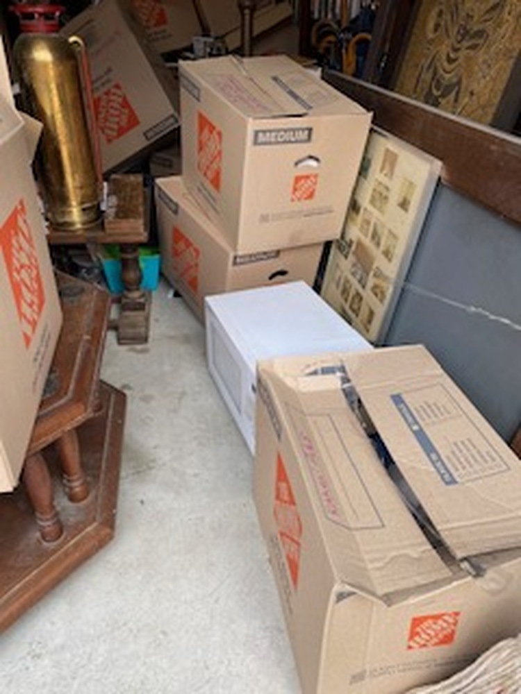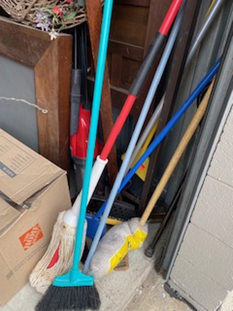 solid wooden shelves, tables, coat racks, boxes, wall art, brooms, mops, many boxes,