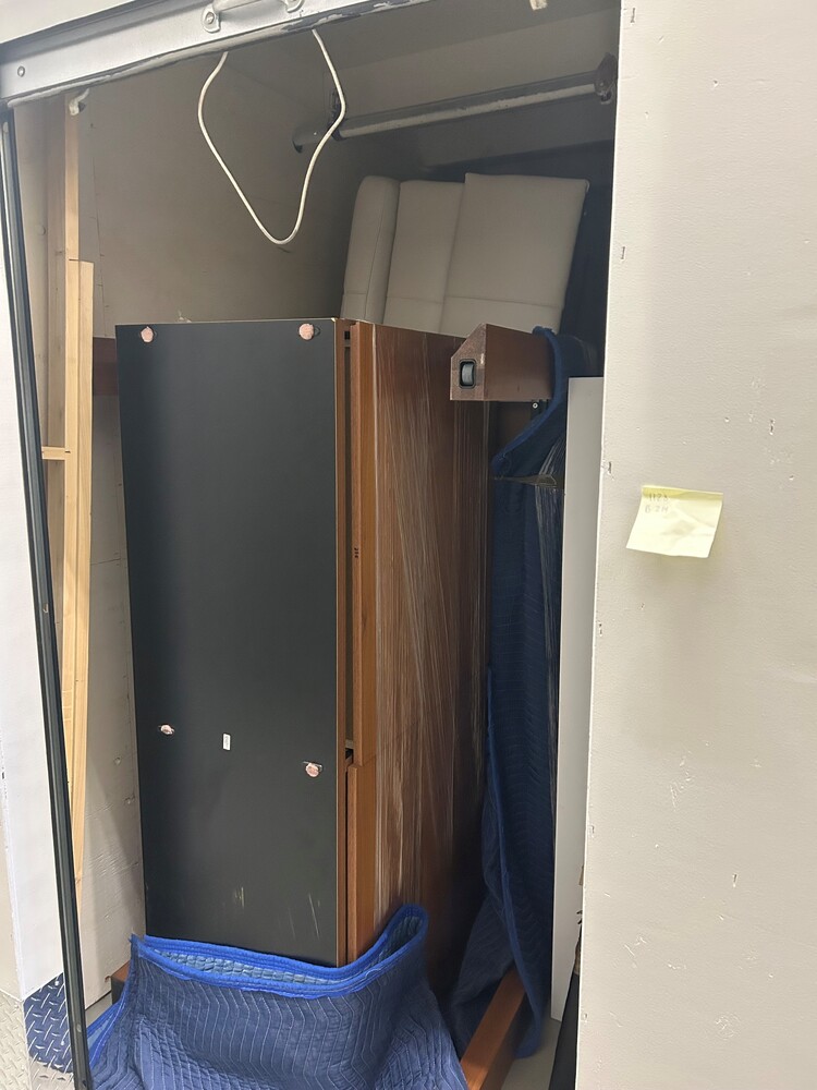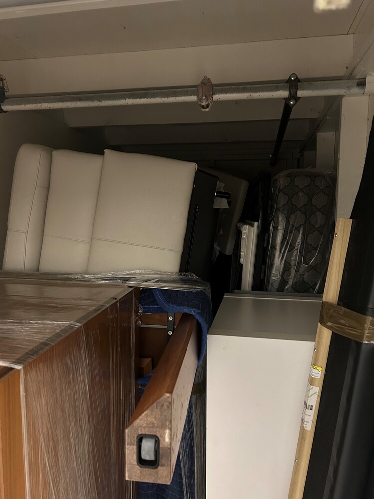 Packed with furniture wrapped in plastic wrap and moving blankets
