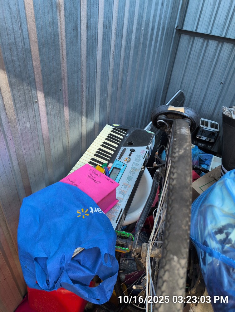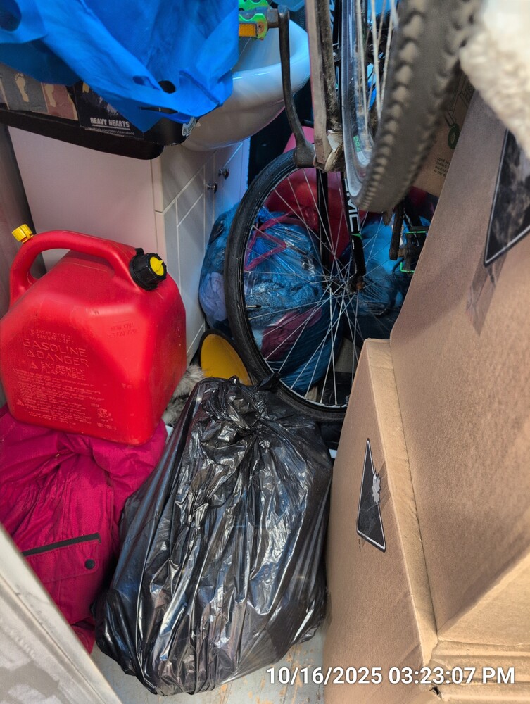 misc boxes/bags/totes, bike, housewares, tv, mirror, keyboard, bathroom vanity