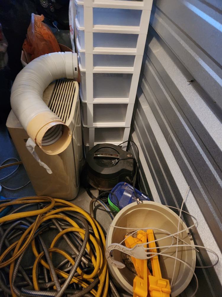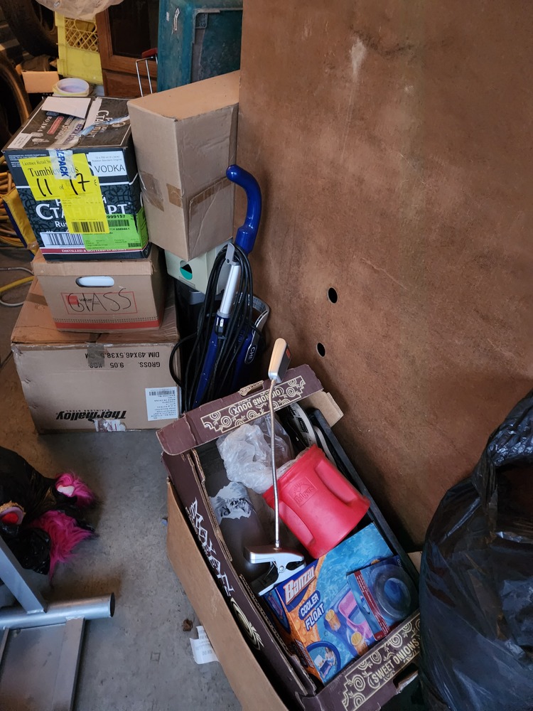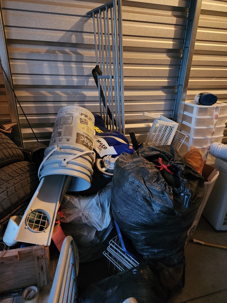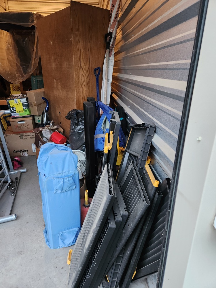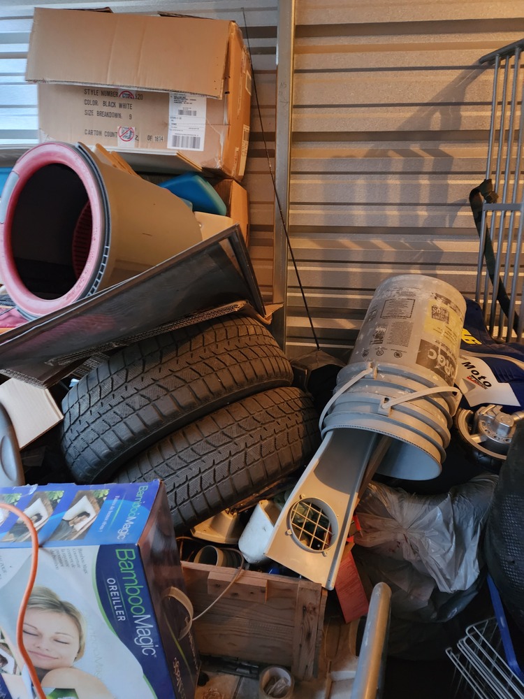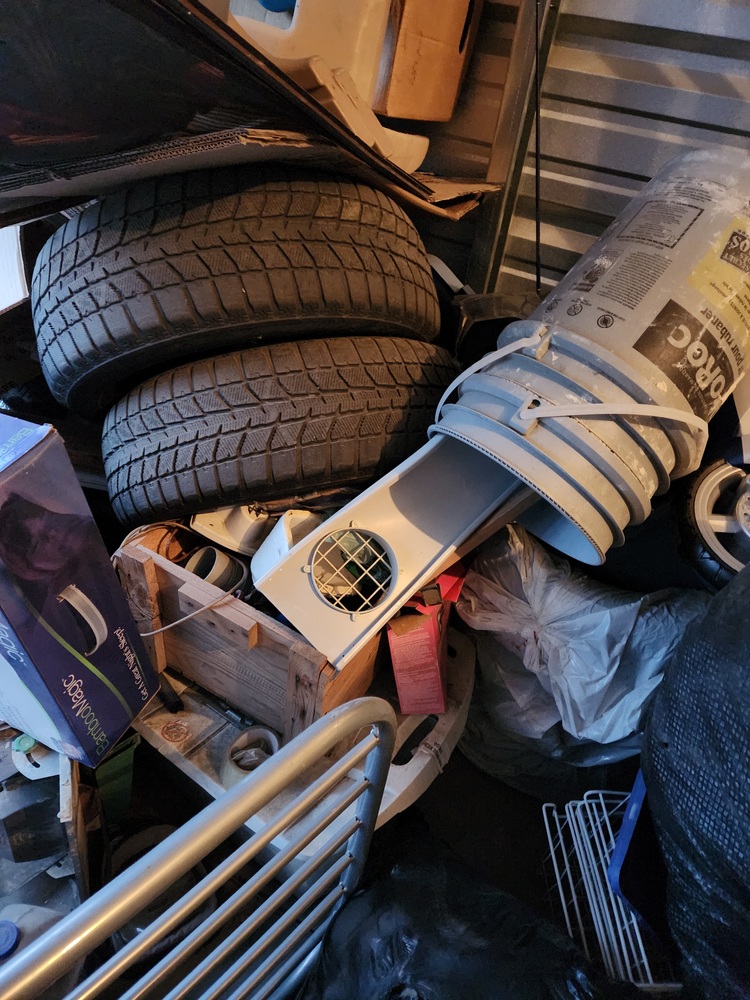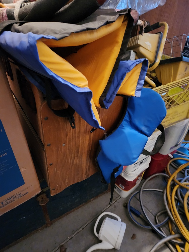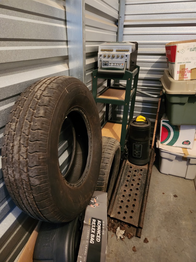 Vehicle ramps, Heaters, Cabinets ,Kids riding toy, Tires, Stroller, Life jackets, Snow shovels, Garden hoses, Wood chest.