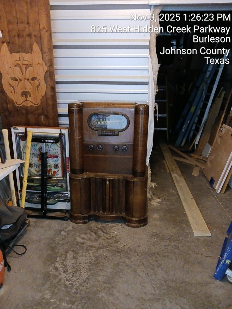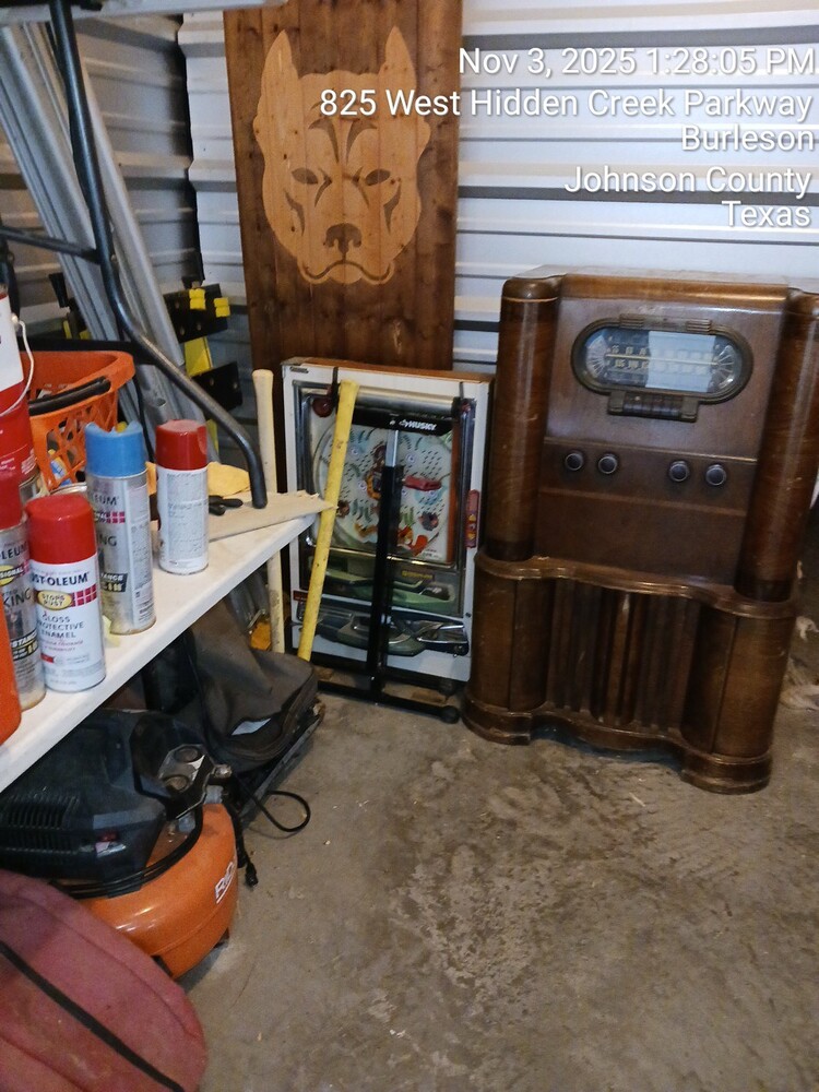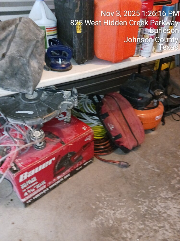 Shopvac, air compressor, saw, 14 portable concrete saw, antique radio, exhaust manifold, Extension cord, Pinball machine, levels, Furniture Dolly, Misc. items