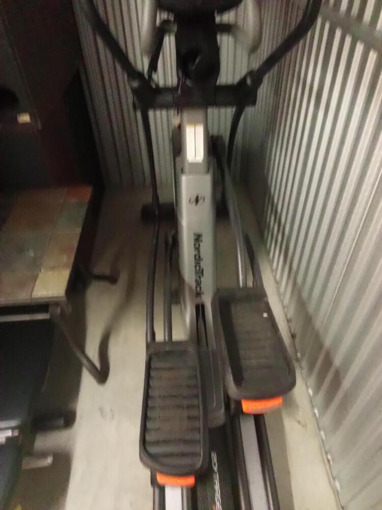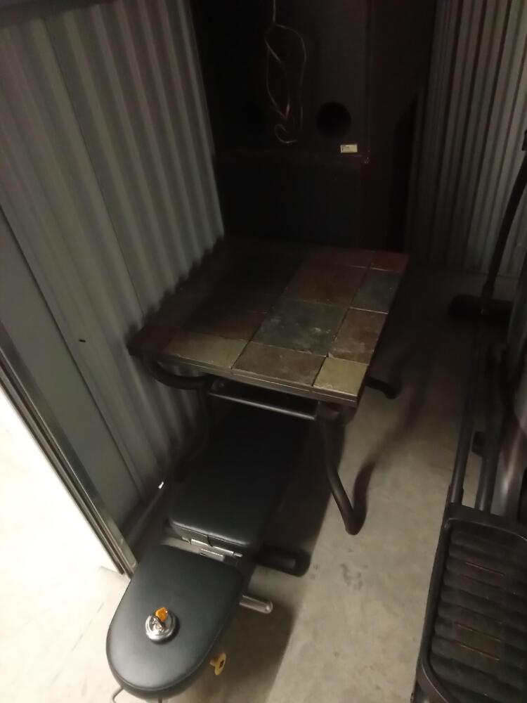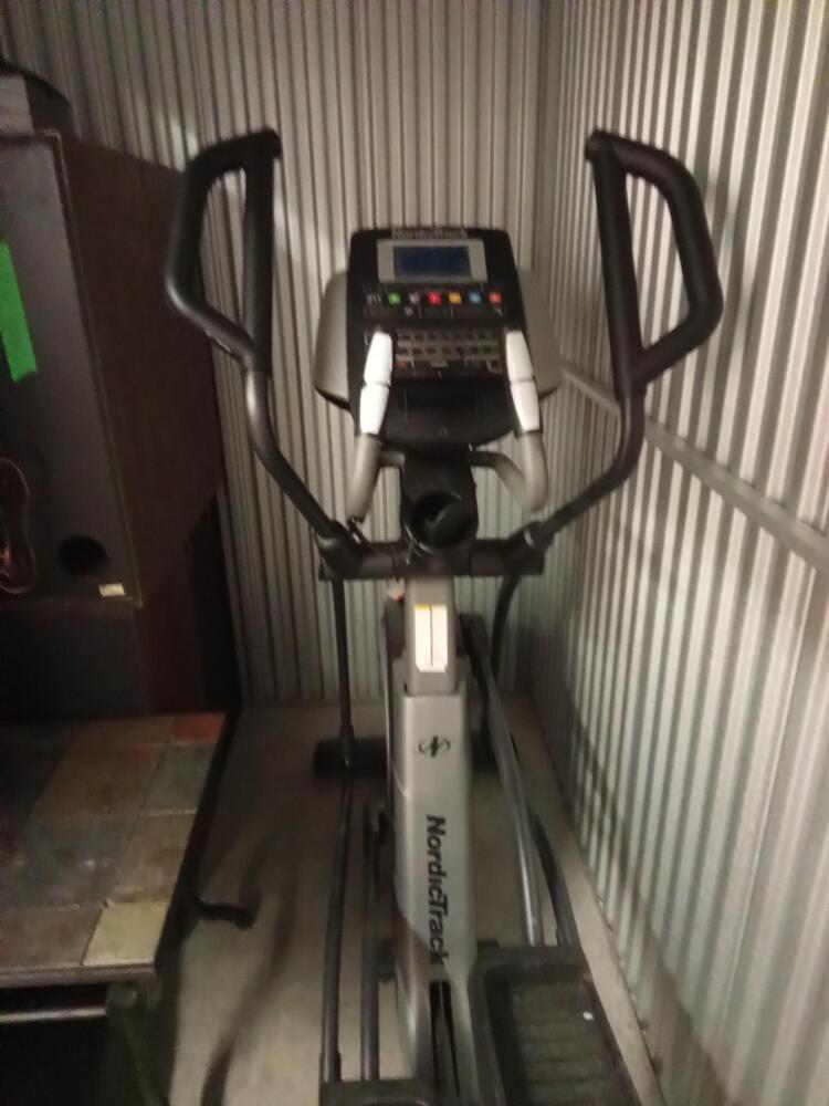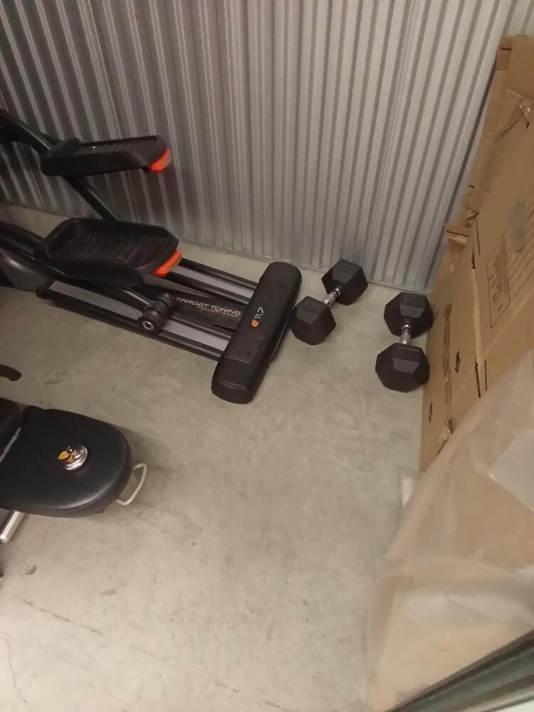 Speakers, Nordictrack eliptical machine, 45 lbs dumbbells, workout benchm side table.