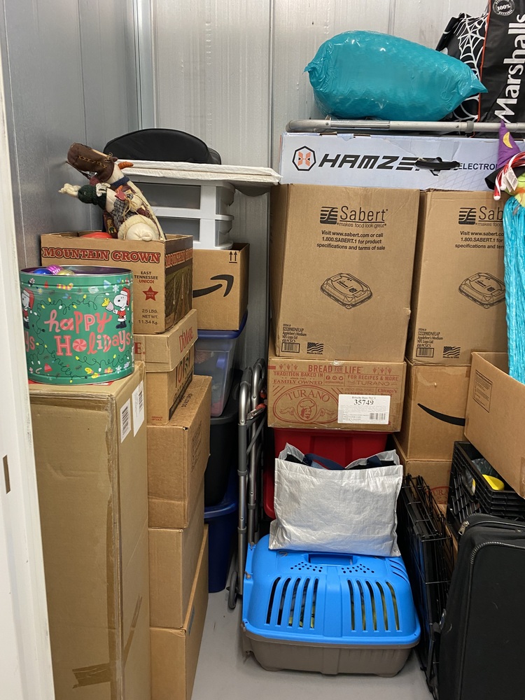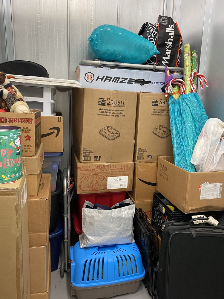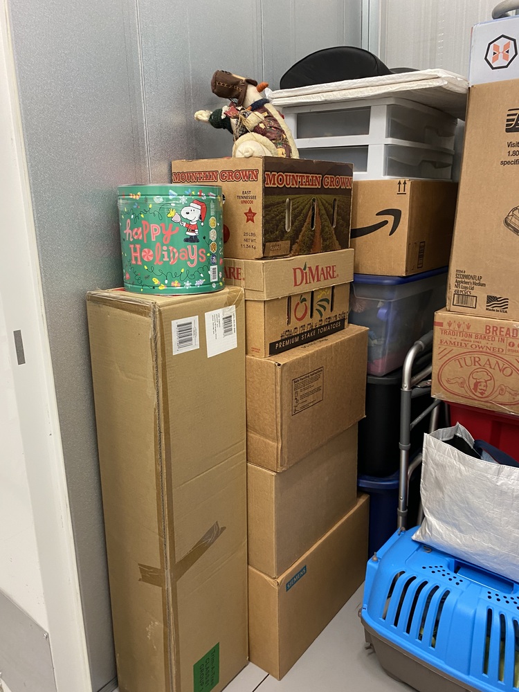 MAY CONTAIN: Pet carrier, walker, boxes, pat crate, totes, Christmas decorations