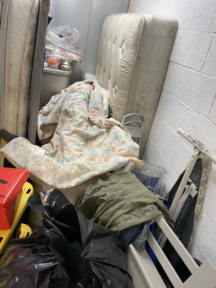 MAY CONTAIN: Mattress set, totes, bags, folding chairs, ironing board, bags