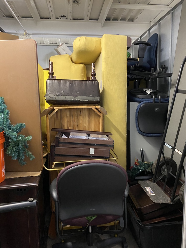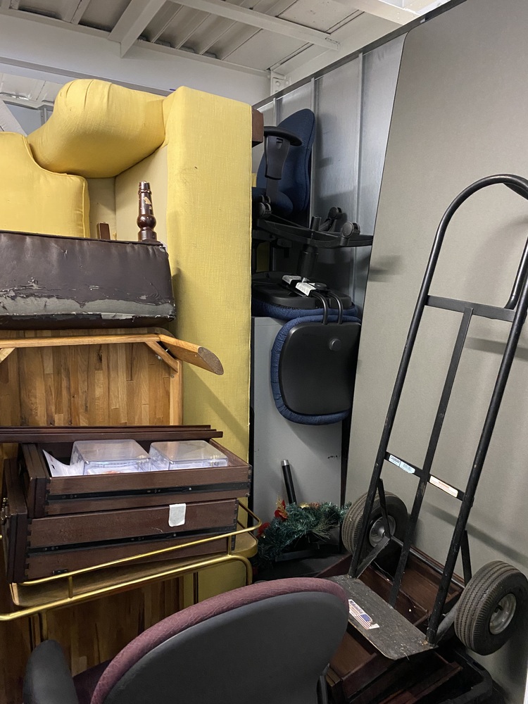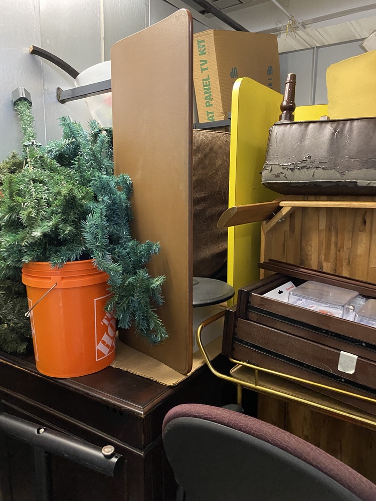 May Contain: Desk chairs, tables, sofa, shadow boxes, hand truck, luggage, Christmas tree