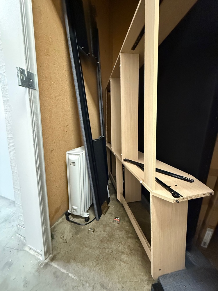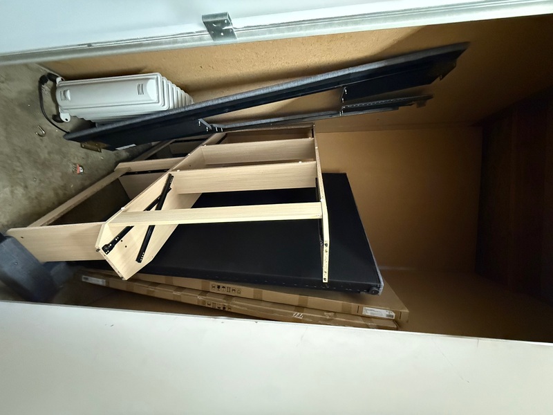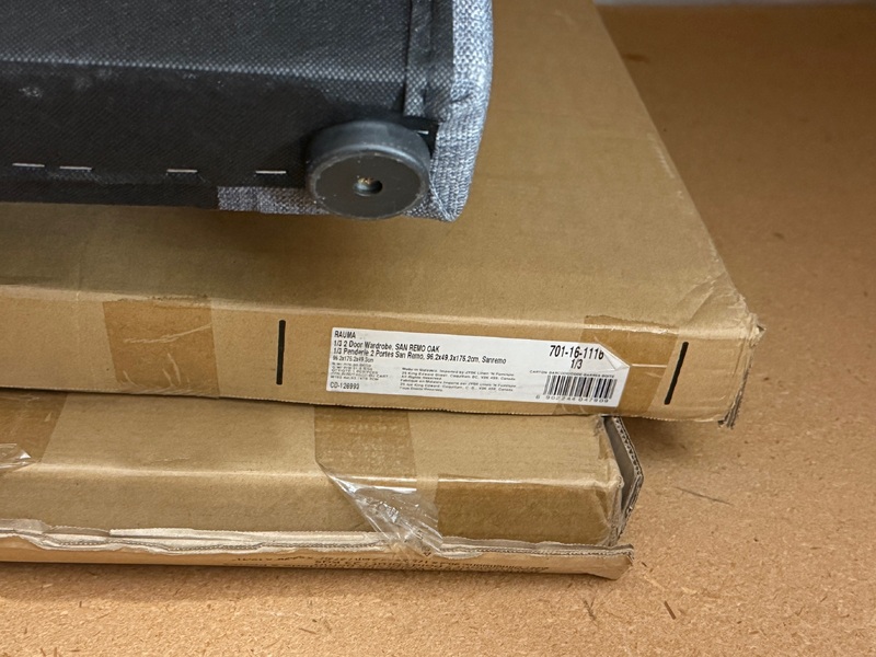 boxed JYSK wardrobe set, wooden frame, cushioned topper (for bed?) + headboard/footboard, floor heater