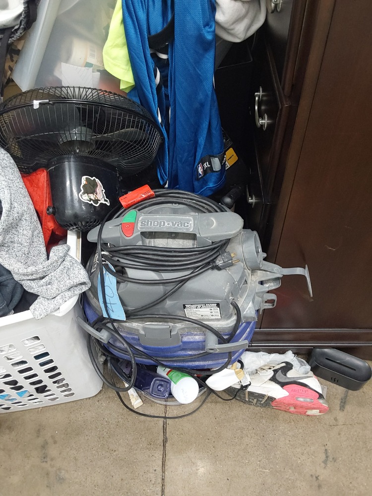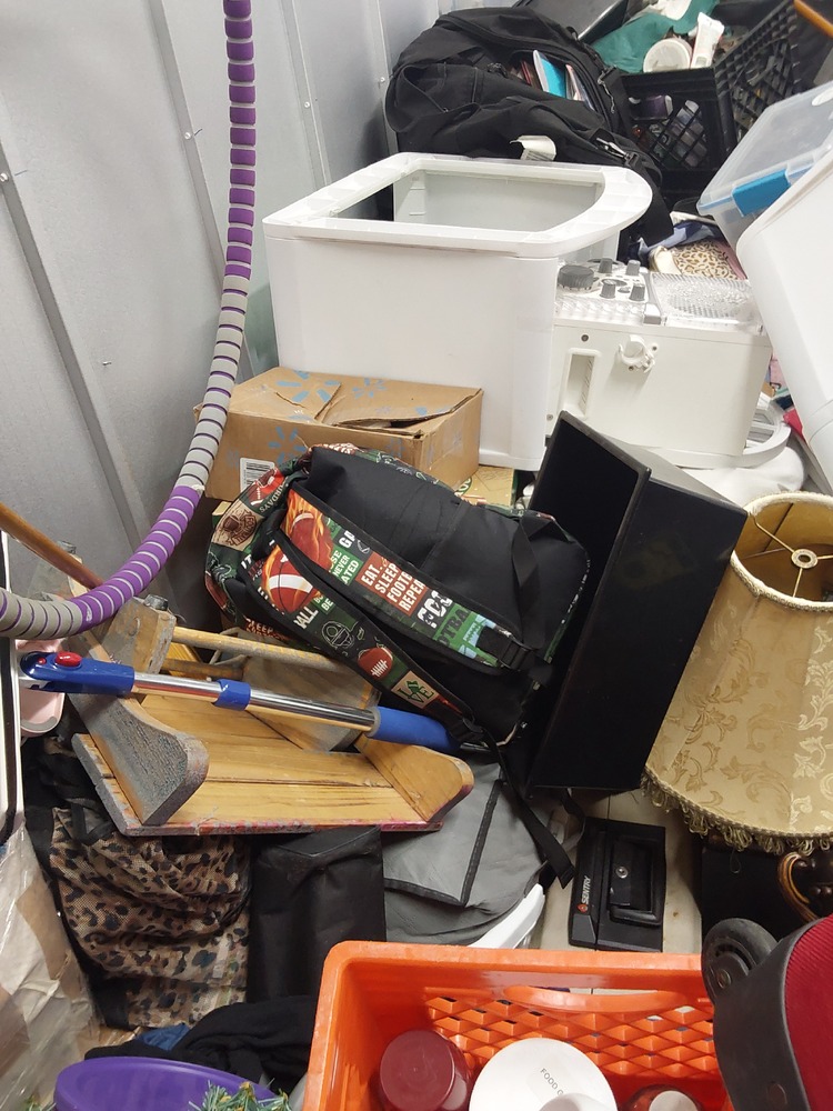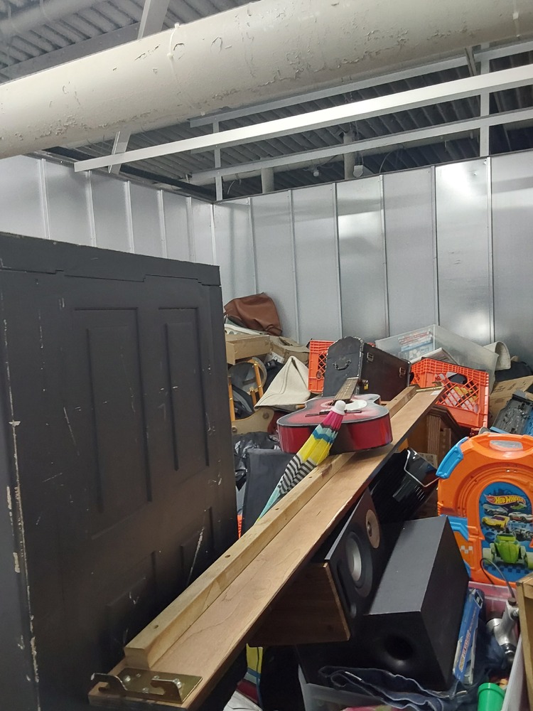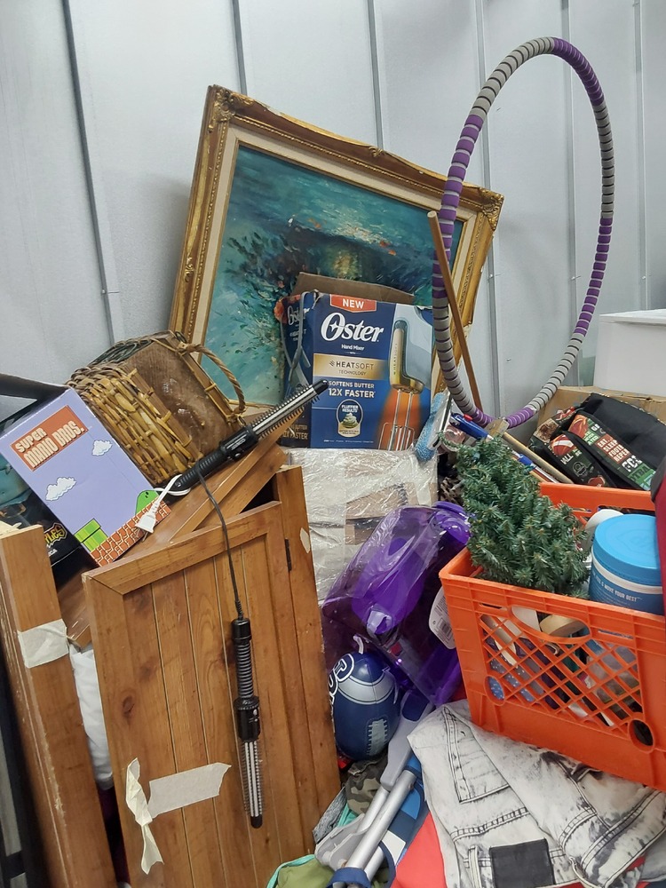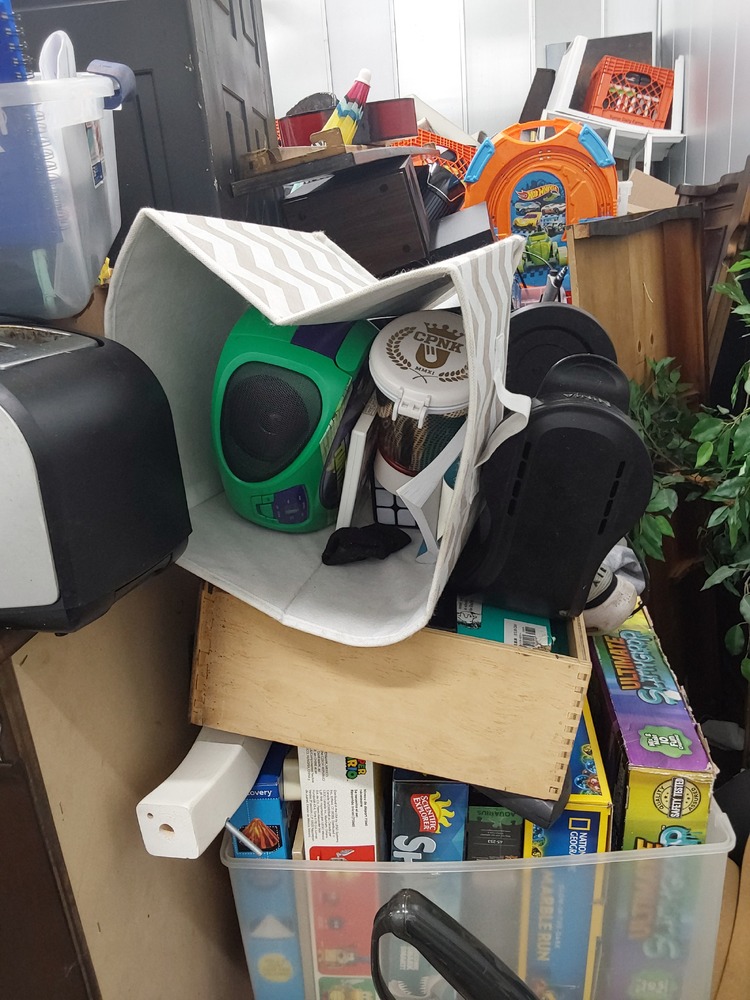 Appears to contain wood dresser, Appears to contain luggage, Appears to contain 3 vacuum cleaners, Appears to contain standing fan, Appears to contain shop vac, Appears to contain various items of clothing, Appears to contain laundry baskets of various items, Appears to contain plastic bins with various household items, Appears to contain toaster, Appears to contain wood coffee table, Appears to contain framed art, Appears to contain wicker basket, Appears to contain camping lamp, Appears to contain kids boardgames, Appears to contain kids toys, Appears to contain fake plant, Appears to contain guitar, Appears to contain umbrella, Appears to contain speakers, Appears to contain hula hoop, Appears to contain backpack, Appears to contain power tool.
