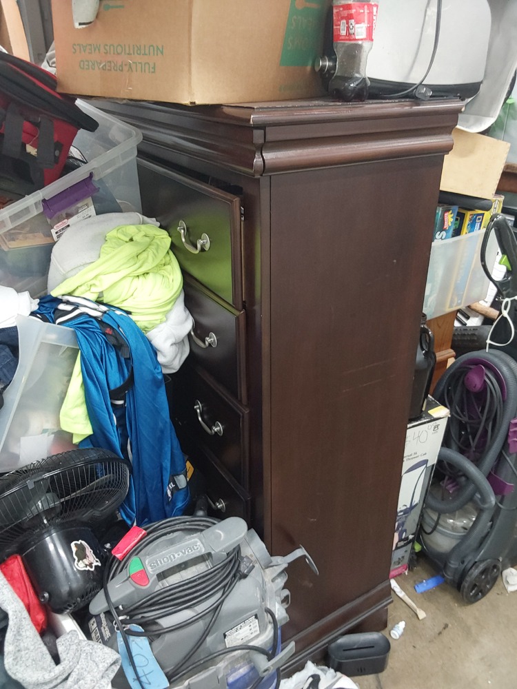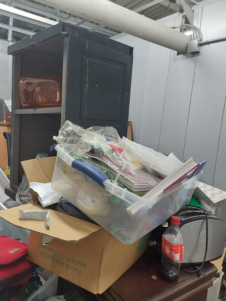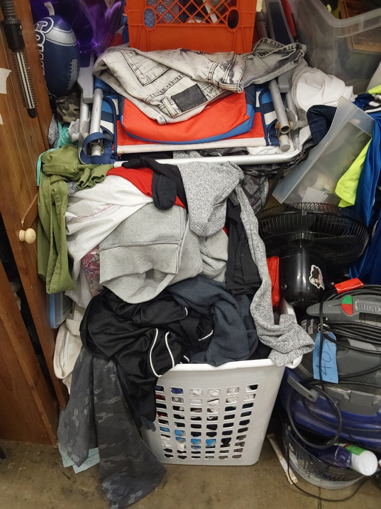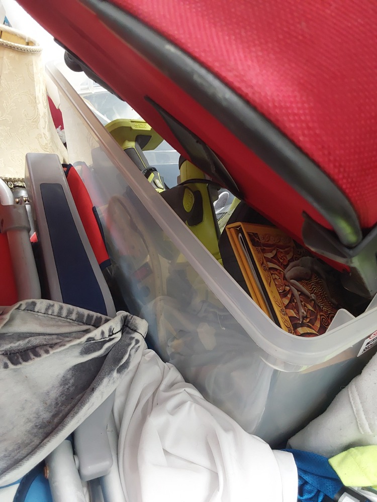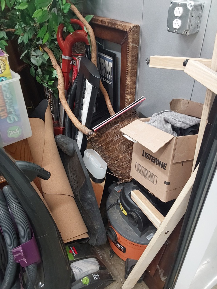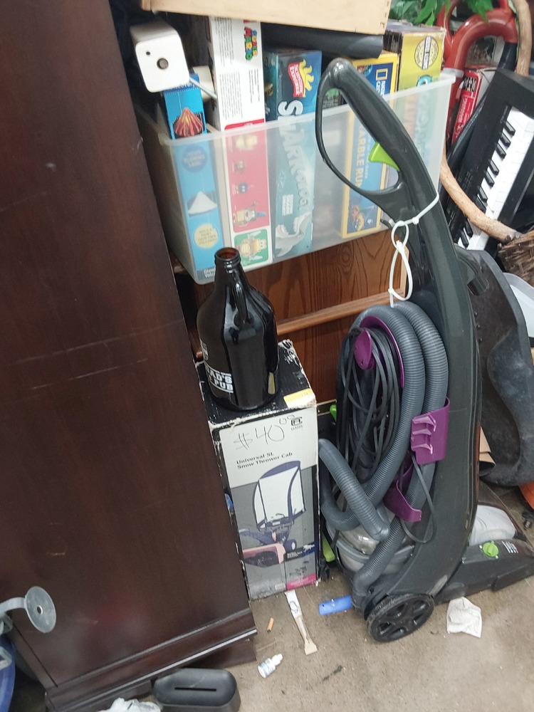 Appears to contain wood dresser, Appears to contain luggage, Appears to contain 3 vacuum cleaners, Appears to contain standing fan, Appears to contain shop vac, Appears to contain various items of clothing, Appears to contain laundry baskets of various items, Appears to contain plastic bins with various household items, Appears to contain toaster, Appears to contain wood coffee table, Appears to contain framed art, Appears to contain wicker basket, Appears to contain camping lamp, Appears to contain kids boardgames, Appears to contain kids toys, Appears to contain fake plant, Appears to contain guitar, Appears to contain umbrella, Appears to contain speakers, Appears to contain hula hoop, Appears to contain backpack, Appears to contain power tool.