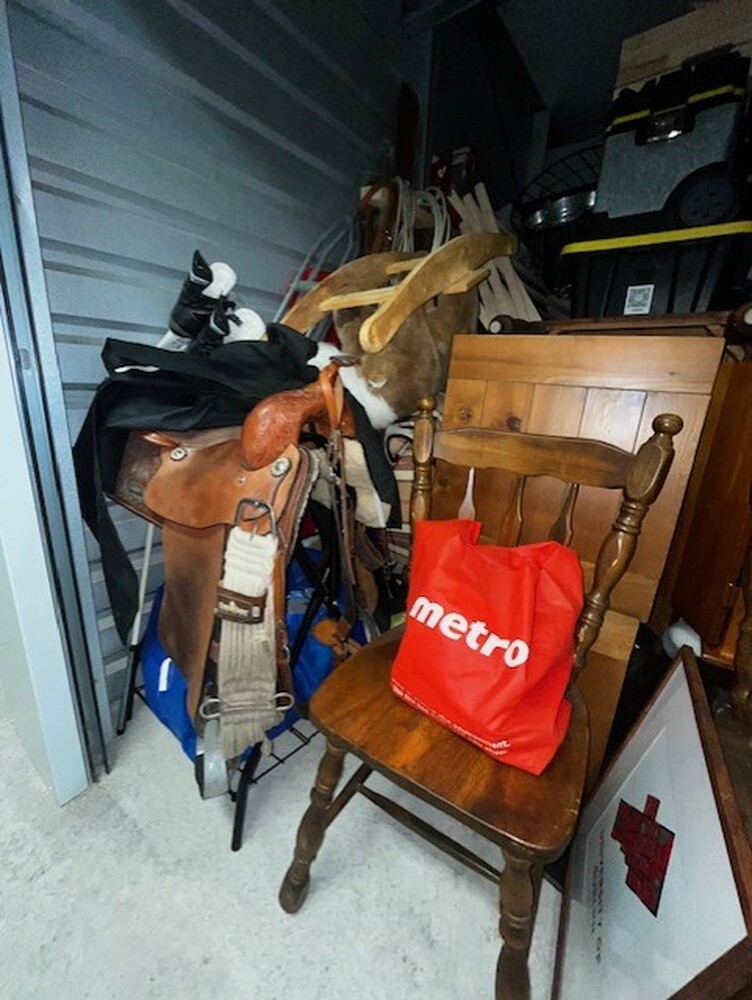 Horse Saddle with stand and cover, horse riding supplies, wooden rocking horse, wooden chairs, wooden book shelf, totes, suit case, tool box on wheels, coffee tables, crock pot, pictures, paddles, boxes and crutches