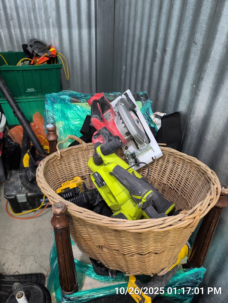 pressure washer, tool boxes, misc totes, skill saw, ext cords, misc furniture, misc ryobi batter tools