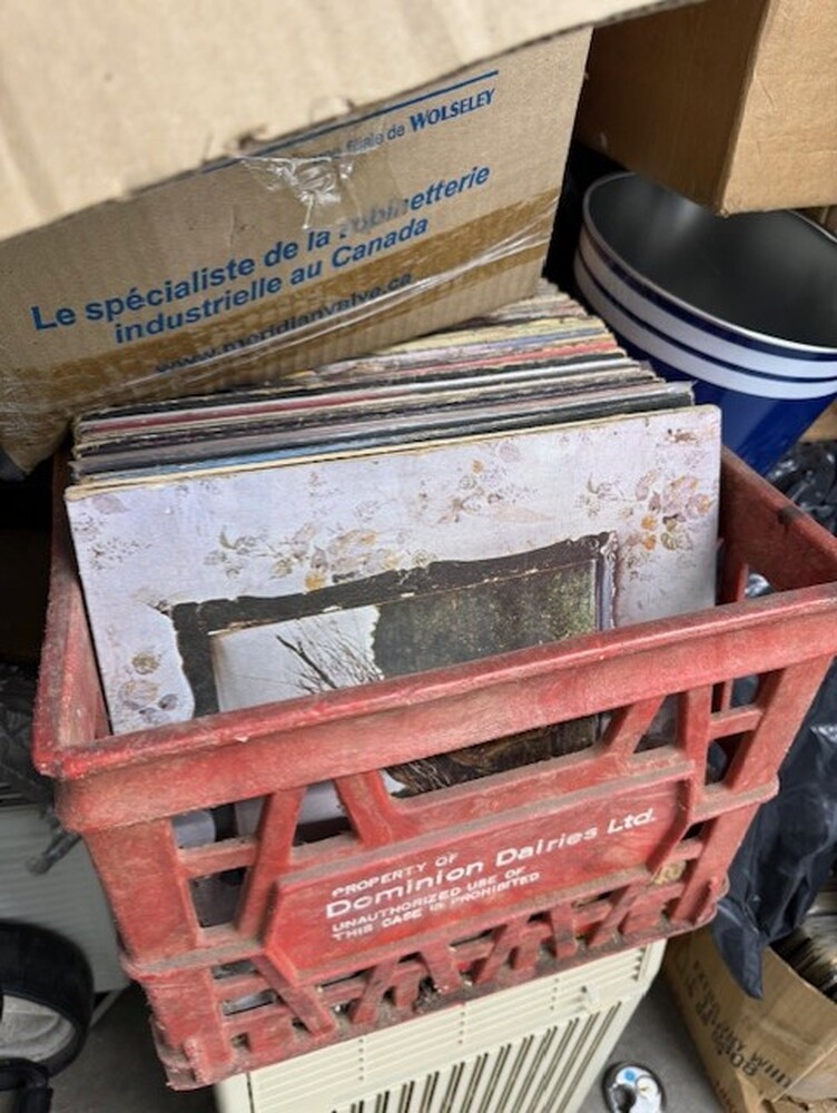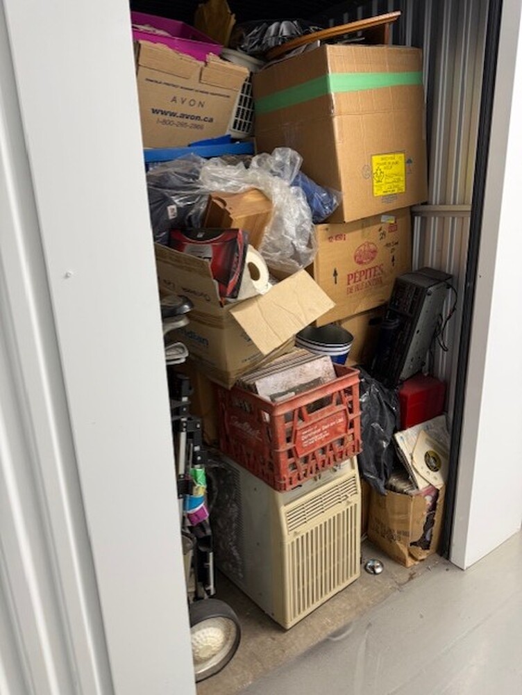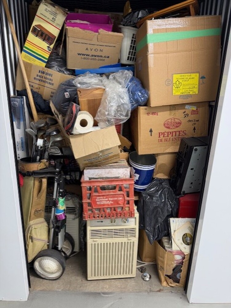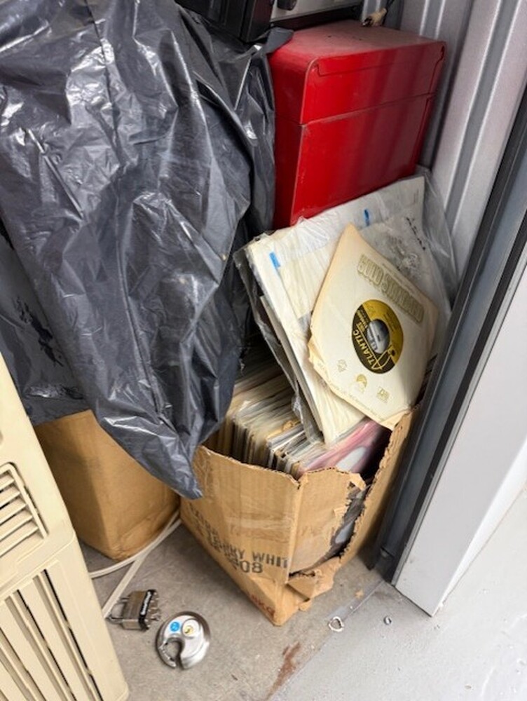 Unit contains records, AC units, a golf bag with clubs, a cassette player, boxes, ext. . .