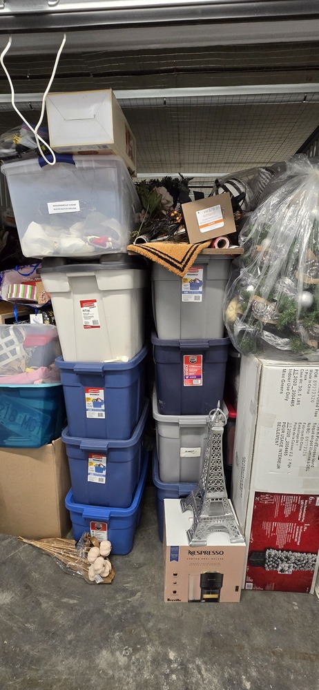 totes, many different holiday decorations, multiple Christmas trees