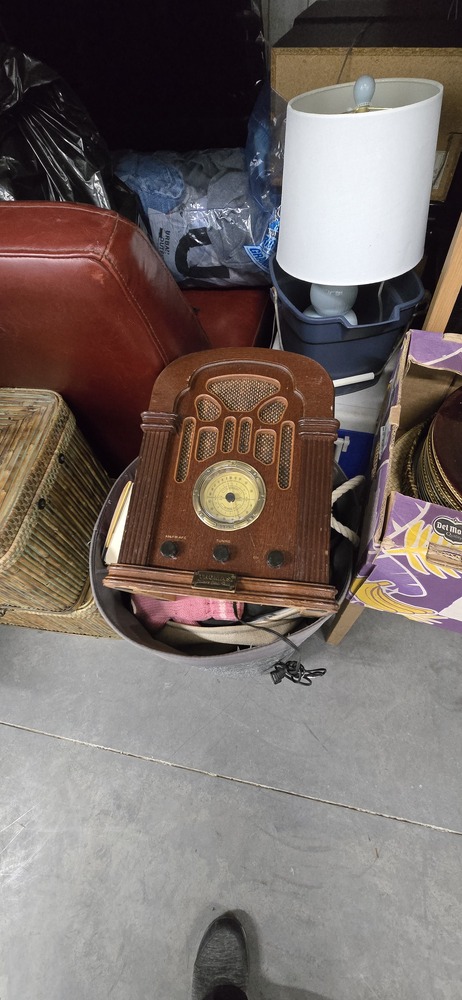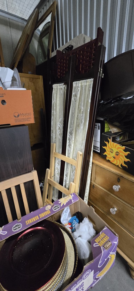 2 mattress, bed frames, dressers, TV, stereo, speakers, misc. boxes, leather chair, totes, kitchen stuff, makeup vanity, sewing machine, wood furniture, coffee table, lamps, mirrors, room dividers, cube shelf, computer and monitor