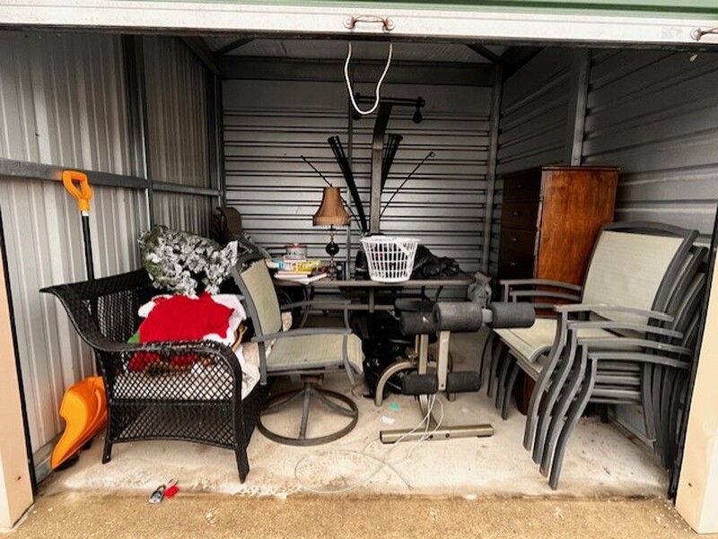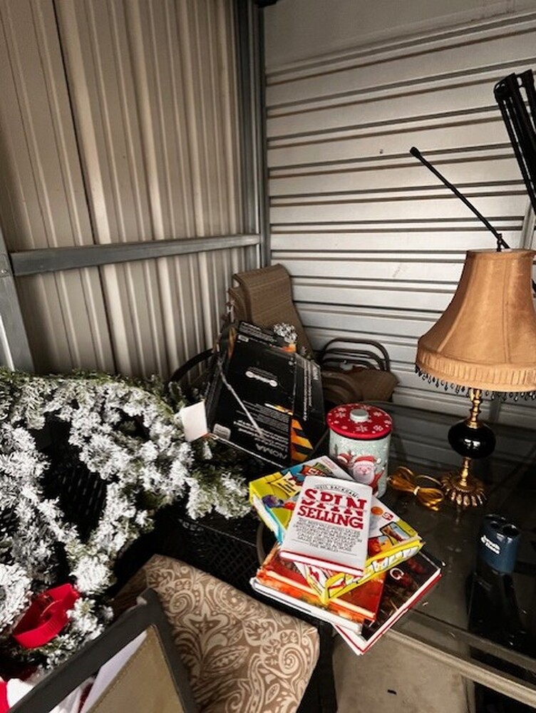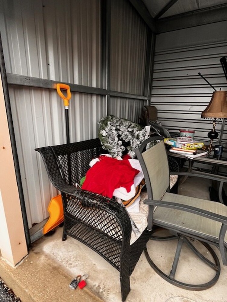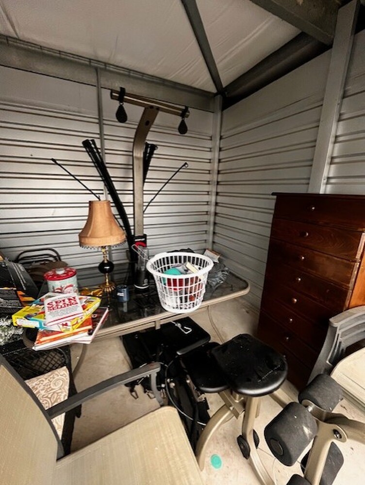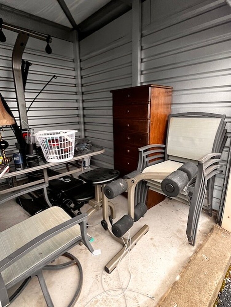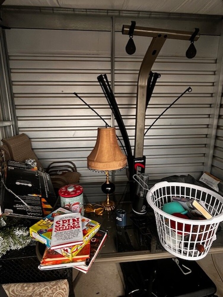Patio Furniture, Books, Christmas Decor, Dresser, Shovel, Blue water jugs, BowFlex work out machine