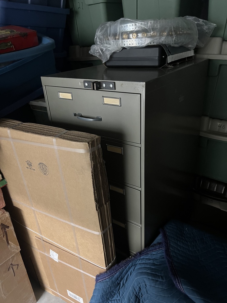 Filing Cabinet, Clear plastic bins, Boxes, Storage bins