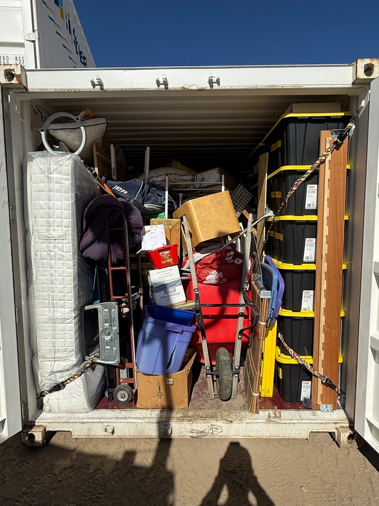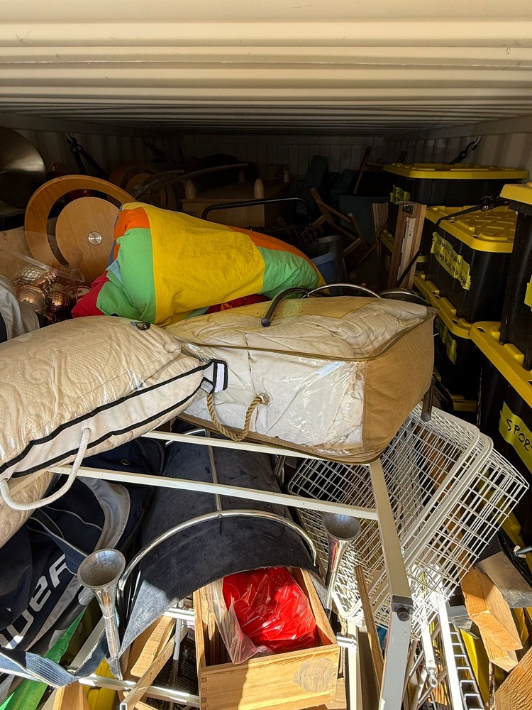 All items are up for auction inside this BigSteelBox unit. Which is loaded with what we believe to be a wheelbarrow, a mattress, moving dolly’s, many storage totes, furniture and other miscellaneous items