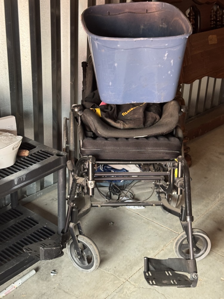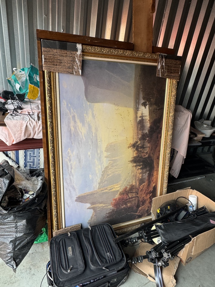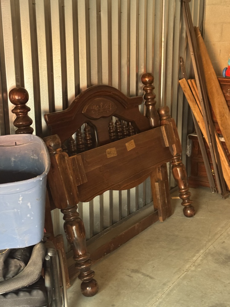 Paintings, bicycle, Wooden Dresser with mirror , old style spinning wheel, wheelchair, plastic bin, boxes, large bed head board