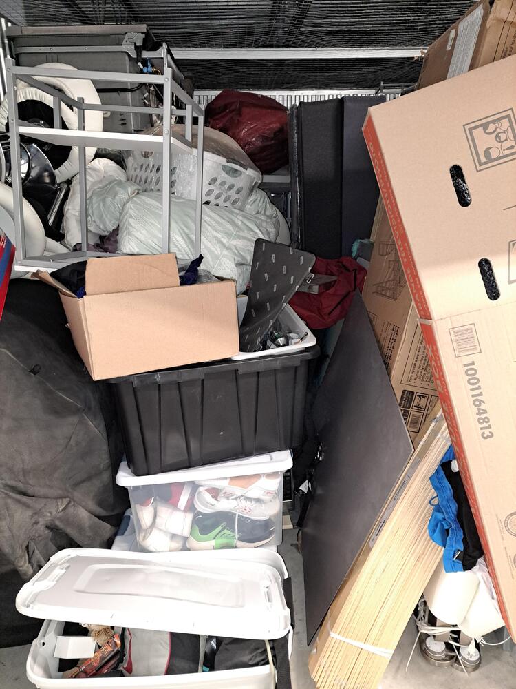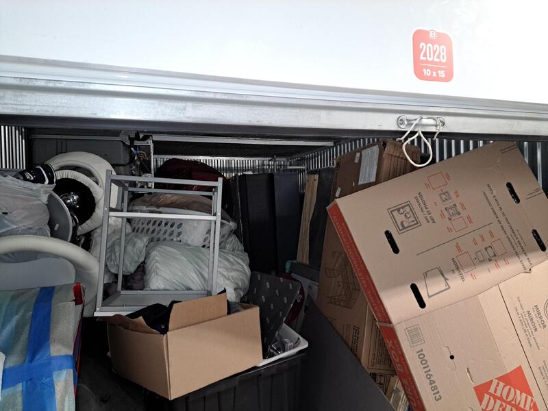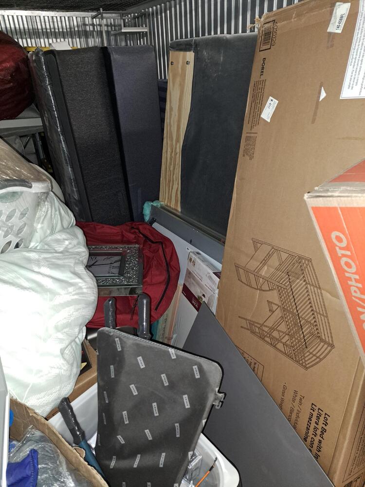 This storage unit has a brand new bunkbed set still in the box, many plastic bins, furniture, etc..