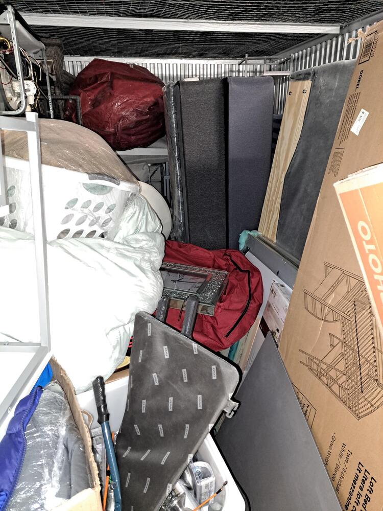 Ce box de stockage contient un ensemble de lits superposés neufs encore dans leur emballage, de nombreux bacs en plastique, des meubles, etc.