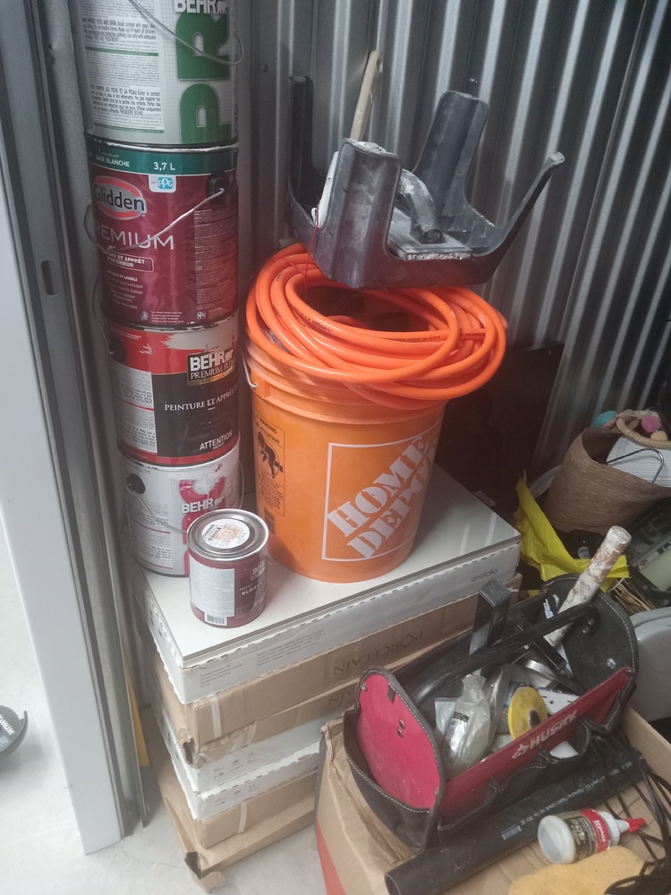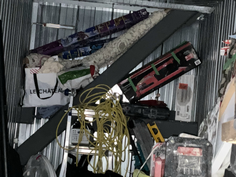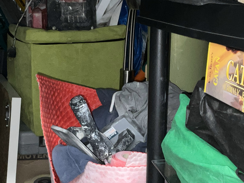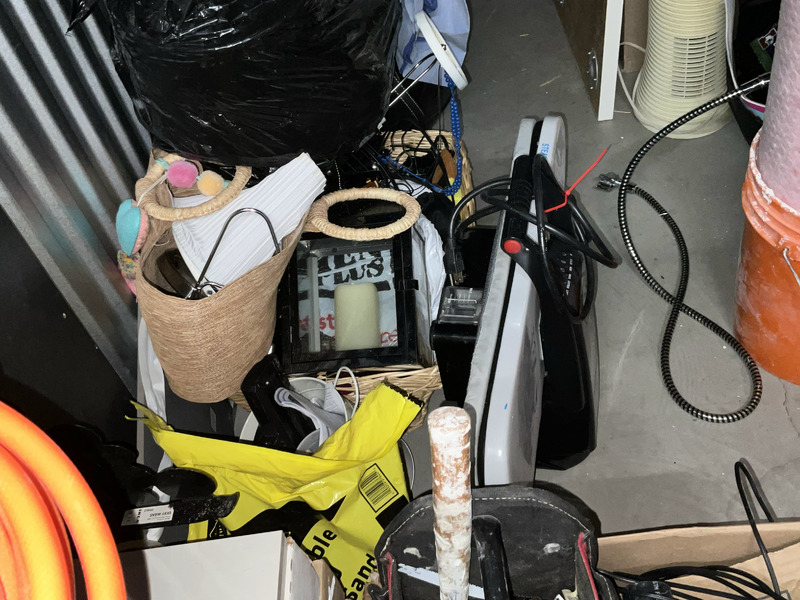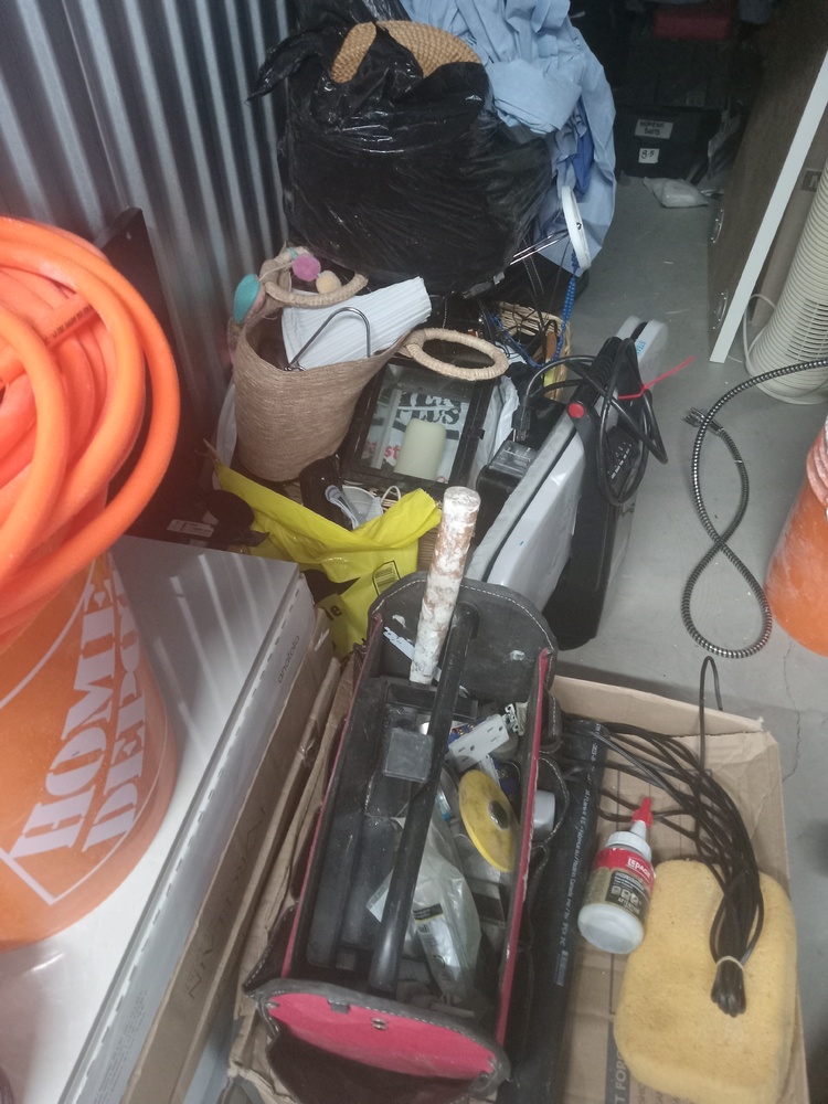 carpets, ladders, steam press, boxes of tiles, Christmas decor, fans, extension cords, paint, boxes, toys, games, tools, tool boxes, kitchen items, artwork, lamp. ETC.