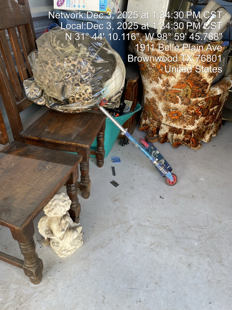 Table and chairs, Microwave, Yard tools, Totes, Furniture, Lamp, Shelves, Scooter, Space heater, Toys, Figurines, Misc. items