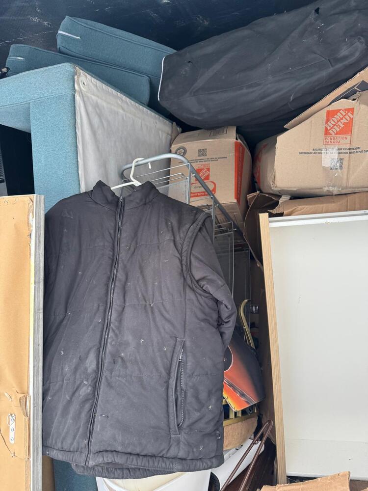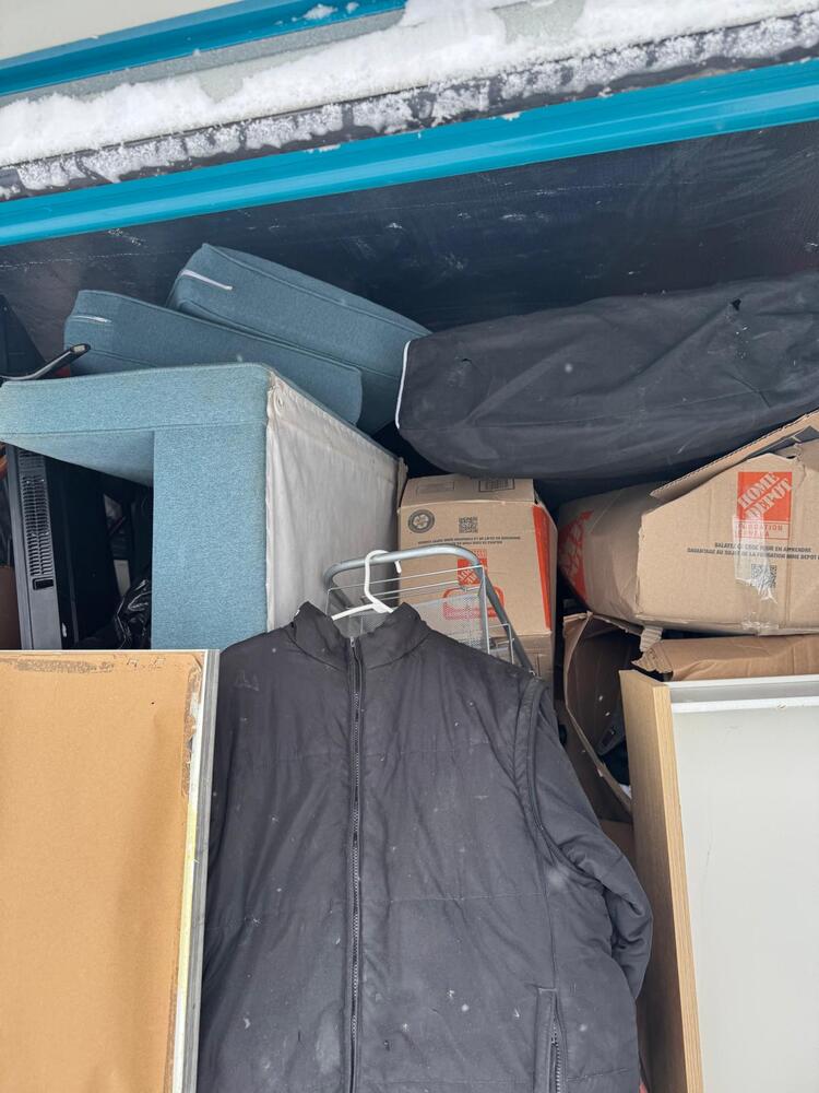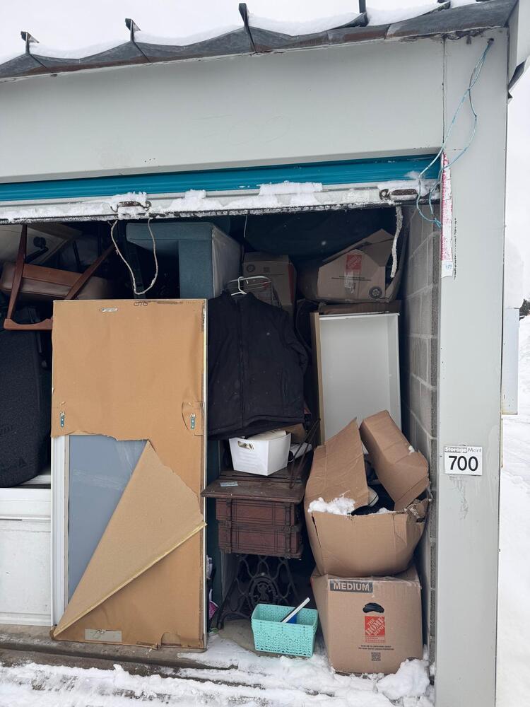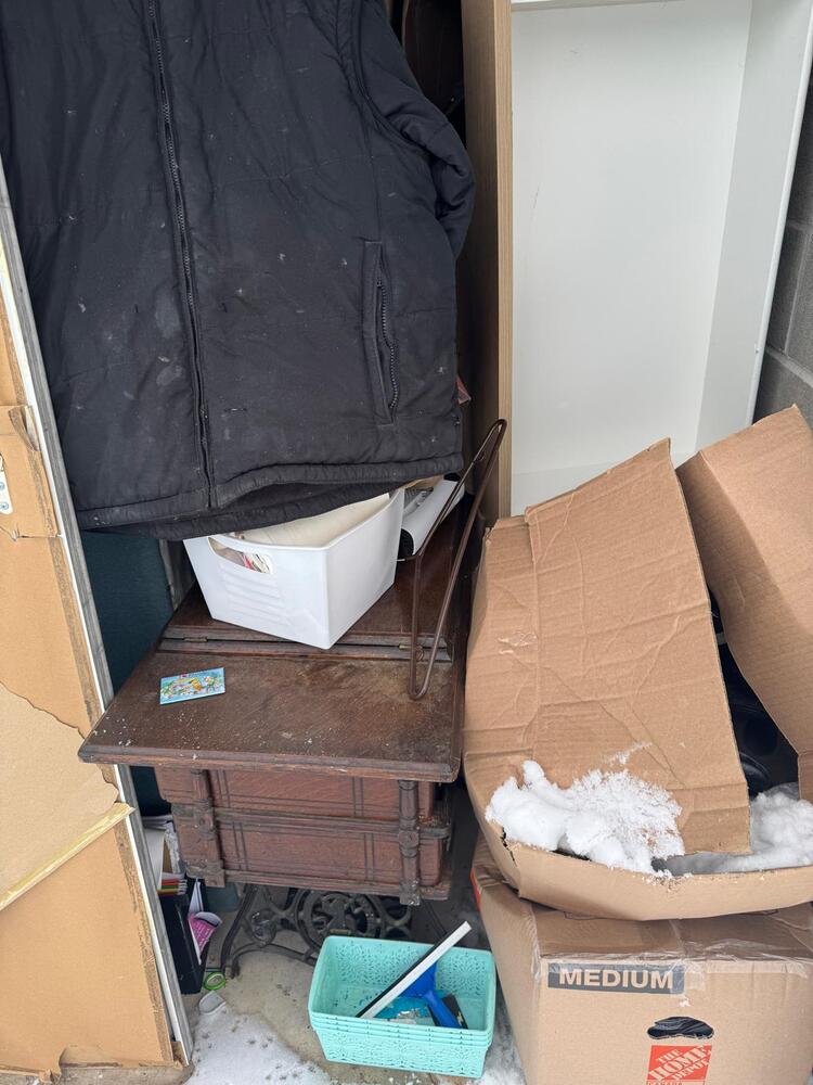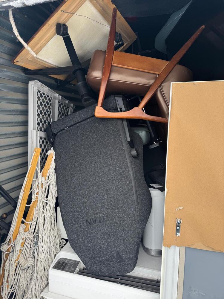 This unit appears to contain a mixed assortment of household items, including a chair, television, couch, mattress, several jackets, and multiple boxes.
