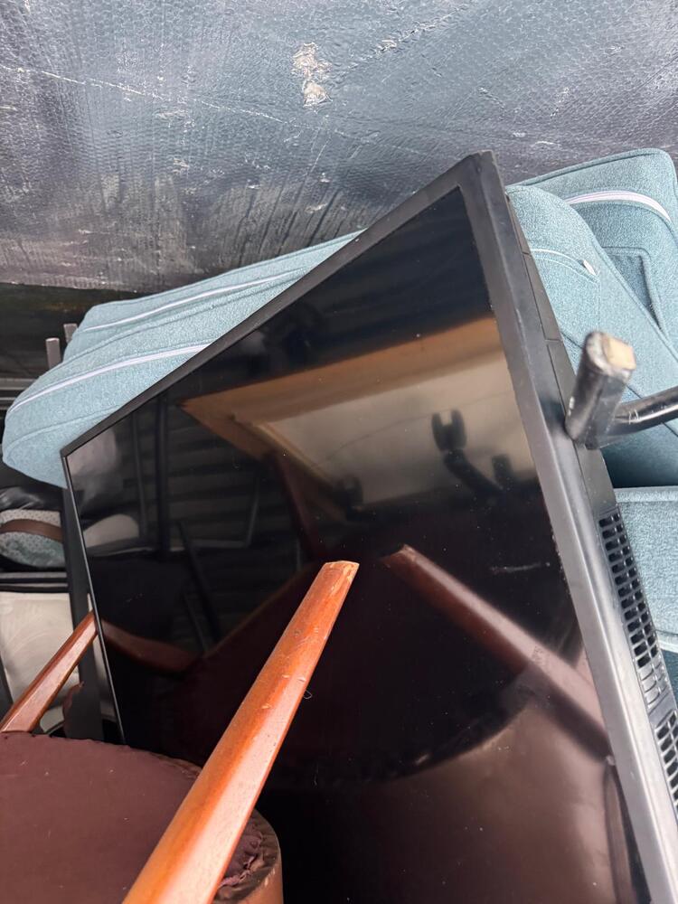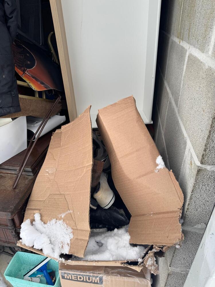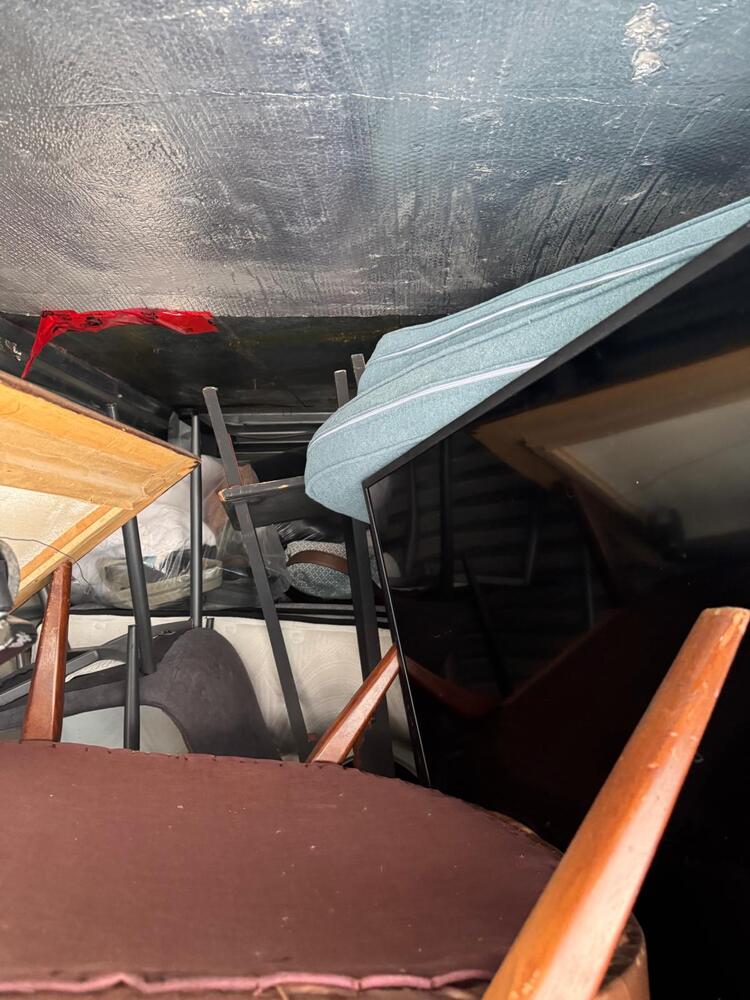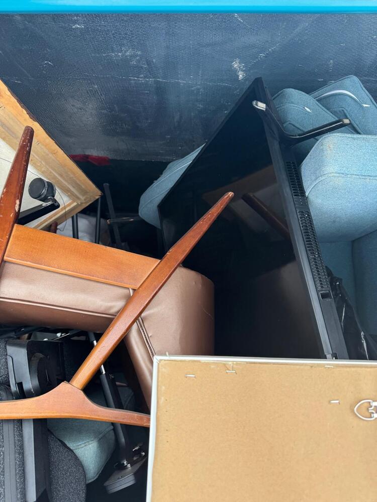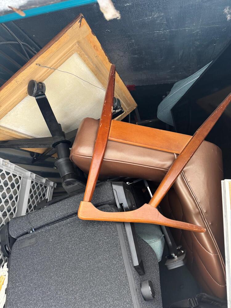 This unit appears to contain a mixed assortment of household items, including a chair, television, couch, mattress, several jackets, and multiple boxes.