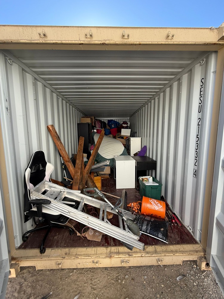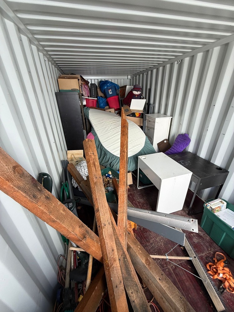 All items inside this 20' BSB container are up for auction. Which is loaded with what we believe to be a ladder, a mattress, furniture, desks, office chair, and other miscellaneous items