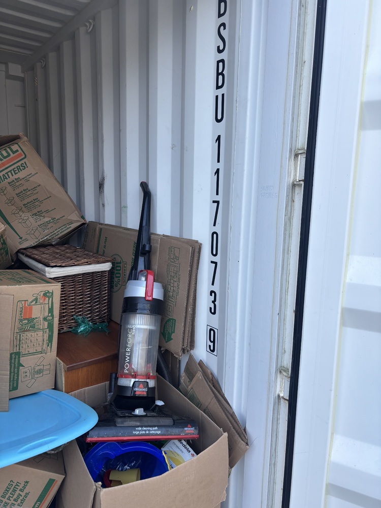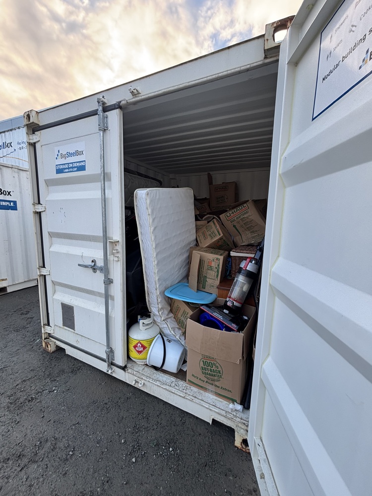 All items inside this 10' BSB container are up for auction. Which is loaded with what we believe to be mattresses, furniture, a vacuum, boxes, and other miscellaneous items