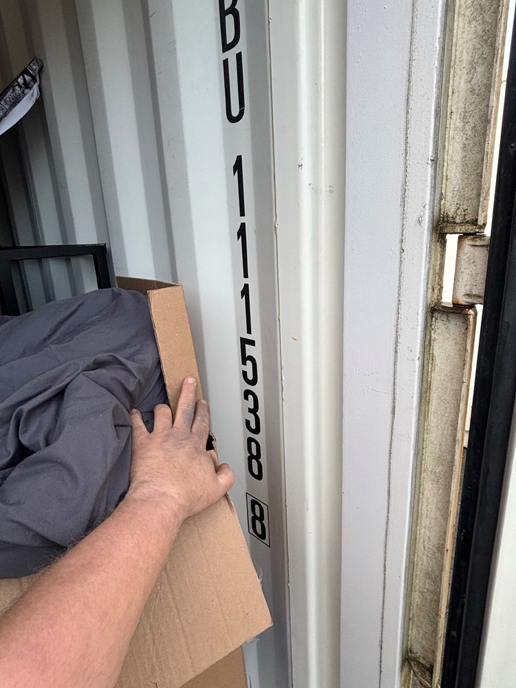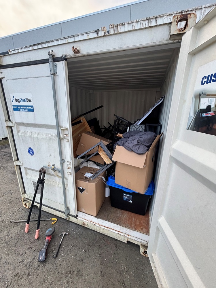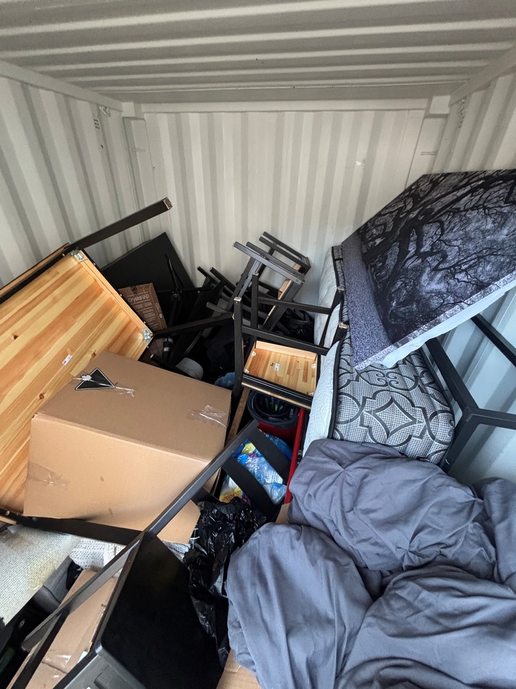 All items inside this 10' BSB container are up for auction. Which is loaded with what we believe to be furniture, a mattress, boxes, and other miscellaneous items