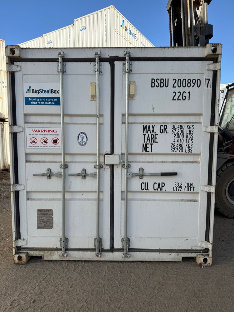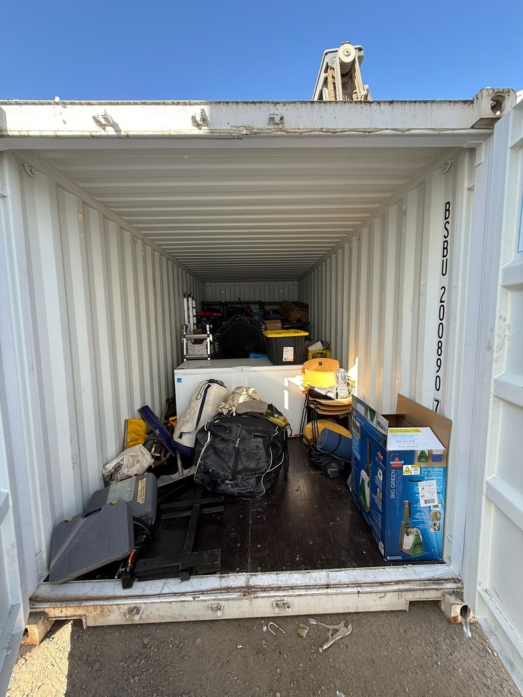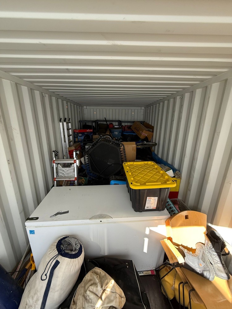 All items inside this 20' BSB container are up for auction. Which is loaded with what we believe to be ladders, furniture, a large carrier bag, shelving,