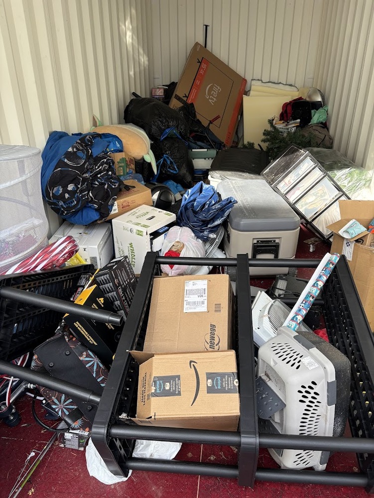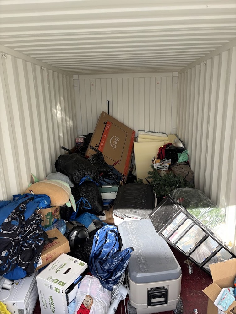 All items inside this 20' BSB container are up for auction. Which is loaded with what we believe to be ac units, household items, Christmas decorations and tree, shelving, camping gear, a cooler, and other miscellaneous items