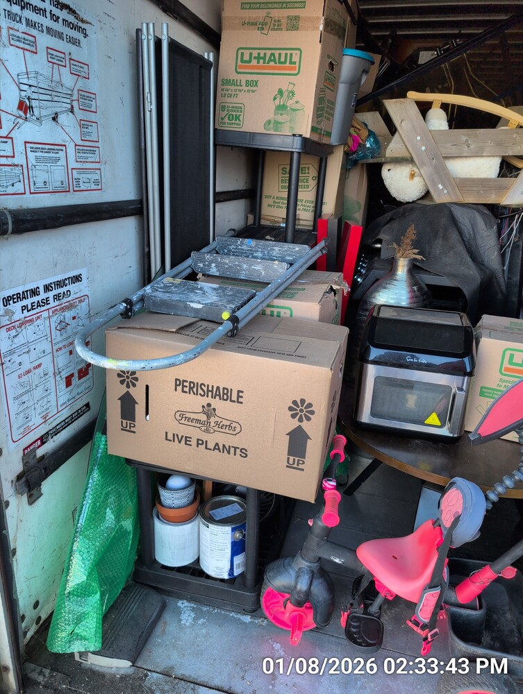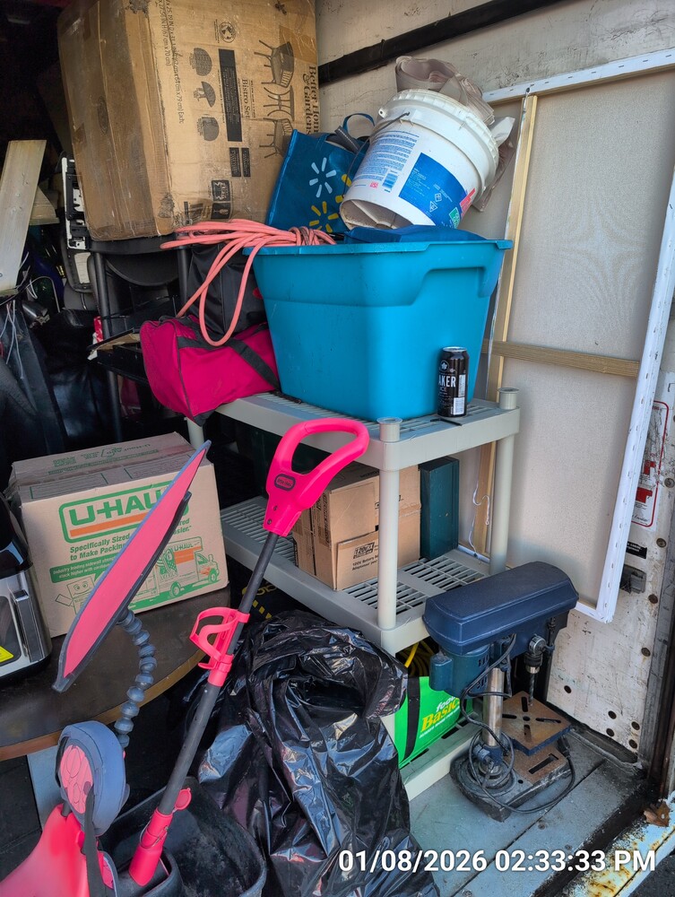 drill press, misc boxes/bags, ladder, coffee table, shelves, bbq, basketball net, misc furniture, wall decor, kids toys