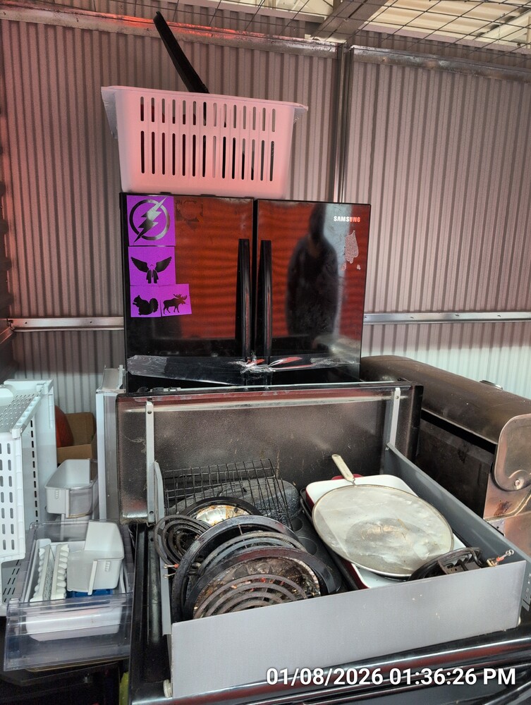 appliances, luggage, chair, housewares, tv stand, misc bags, plastic drawers
