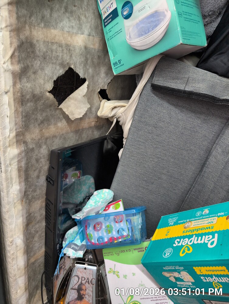 tv, monitor, misc boxes/bags/totes, misc furniture, clothing