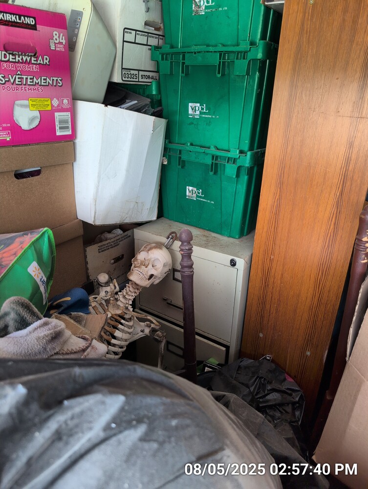 misc boxes/bags/totes, laundry baskets, bbq, folding ladder, luggage, armoire, misc furniture, fishing rods, filing cabinet, skeleton