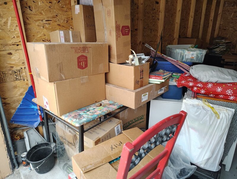 Boxes, decorations, art table, chair, table, bench, desk and plastic bins.