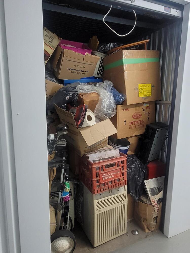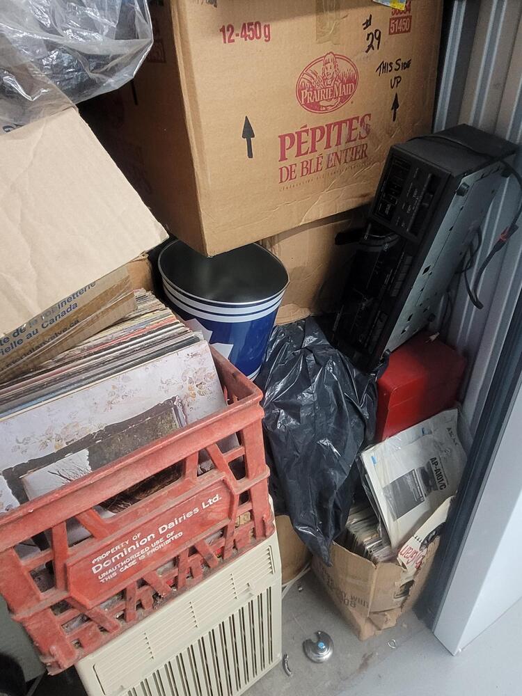 Unit contains, records, AC units, golf bag with clubs, cassette player, boxes, ect. . .