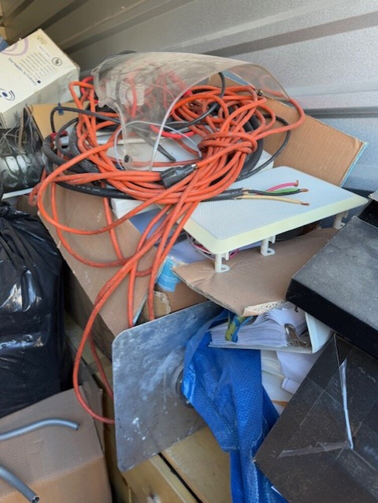 Unit contains, boxes, extension cords, electronic parts, an office chair, ect. . .