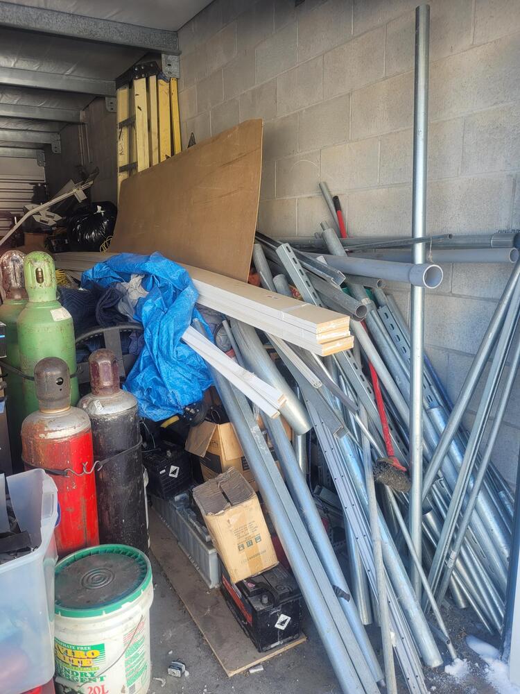 Unit contains, tires, a refrigerator, sofa, building material, ladders, hydraulic press, ect. . .