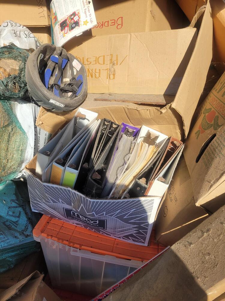 Unit contains, books, boxes, plastic totes, a scooter, a hand truck, ect. . .