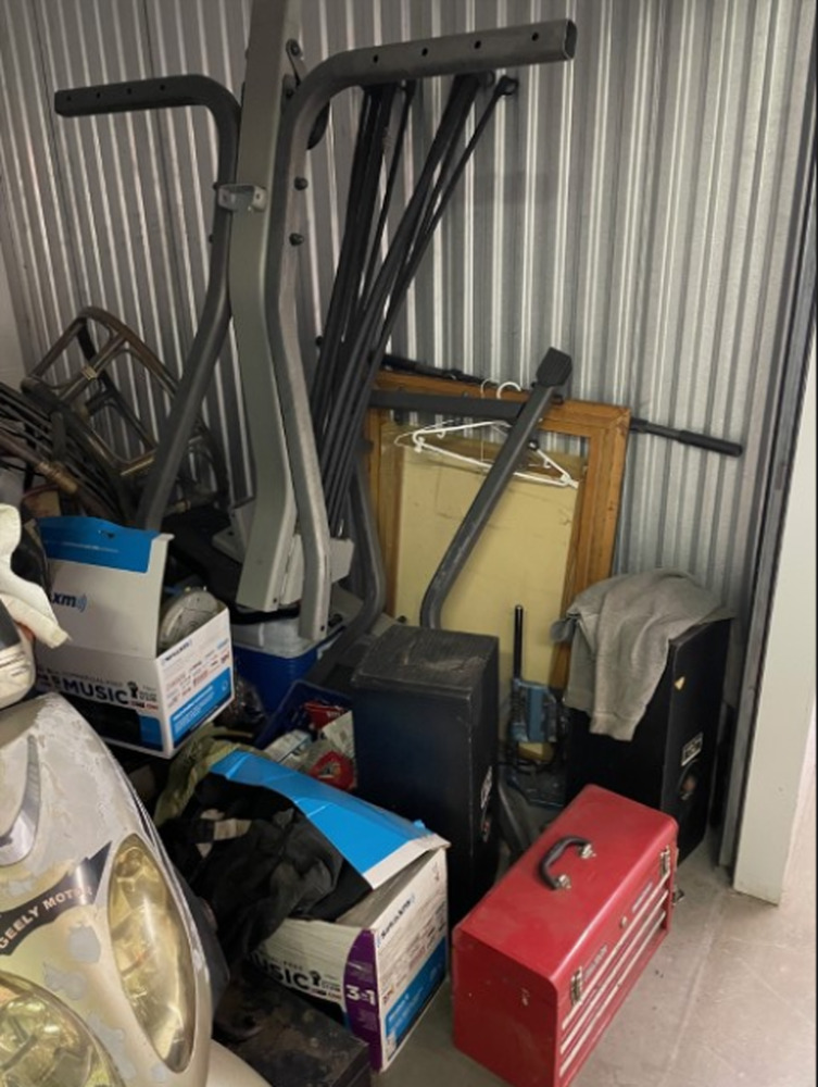 Scooter, maybe fishing rods, could be some exercise equipment, tool box and other misc. items