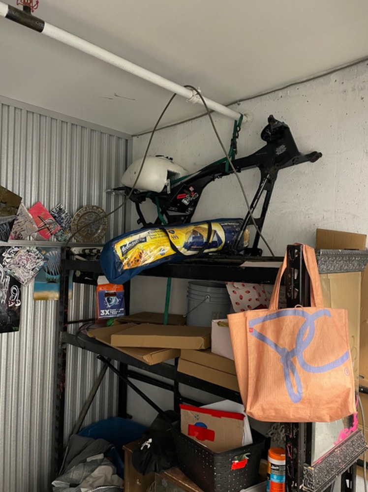 Looks like a few helmets. Maybe a parts motorcycle? ++++ ? Shelving unit and other misc. items